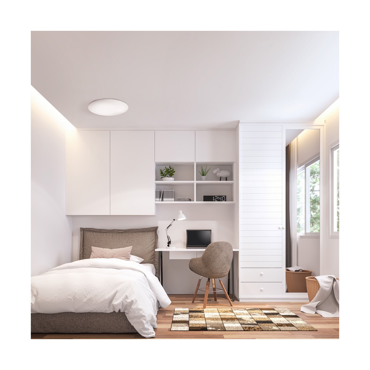Plafón Sever con iluminación led integrada de 42W con tres temperaturas regulables en intensidad. Incluye mando a distancia para configurar la ilumnación deseada y activar el modo noche. Al encender desde el interruptor de la pared trás permanecer al menos 20 segundos apagado recupera la ultima configuración de encendido.