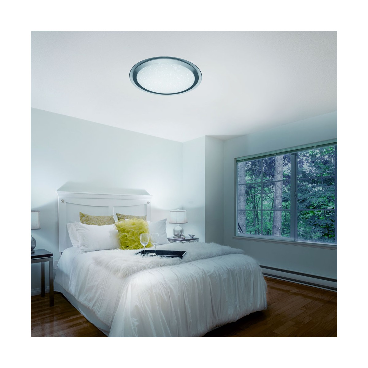 Plafón LED de 85 W con tres temperaturas, luz cálida, neutra y fría, dimmable con luz de noche. Incluye mando a distancia. Difusor con efecto estrellas.