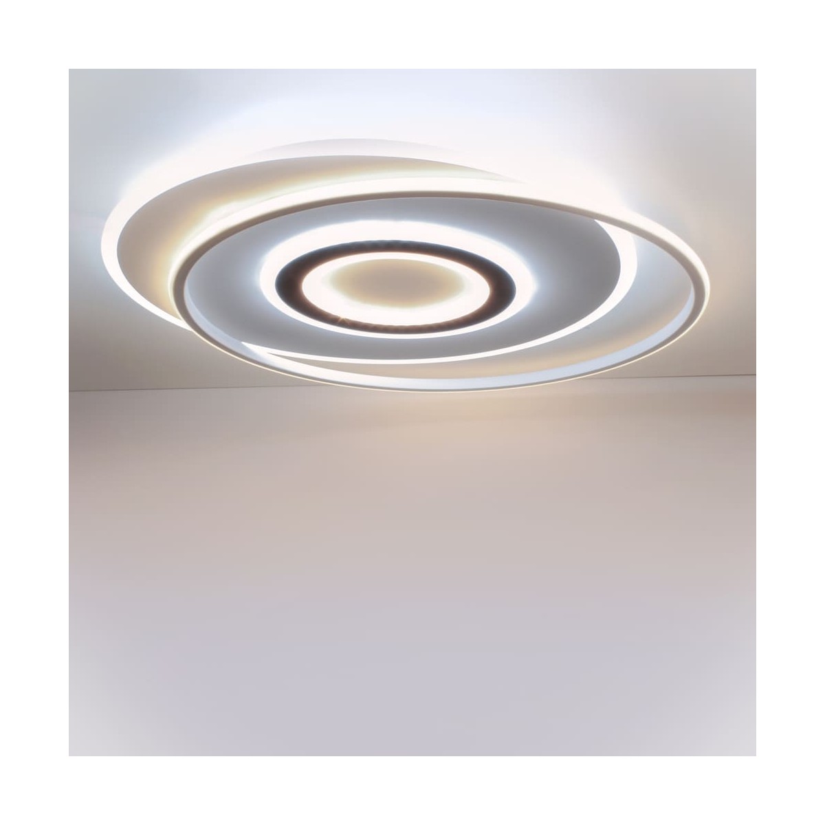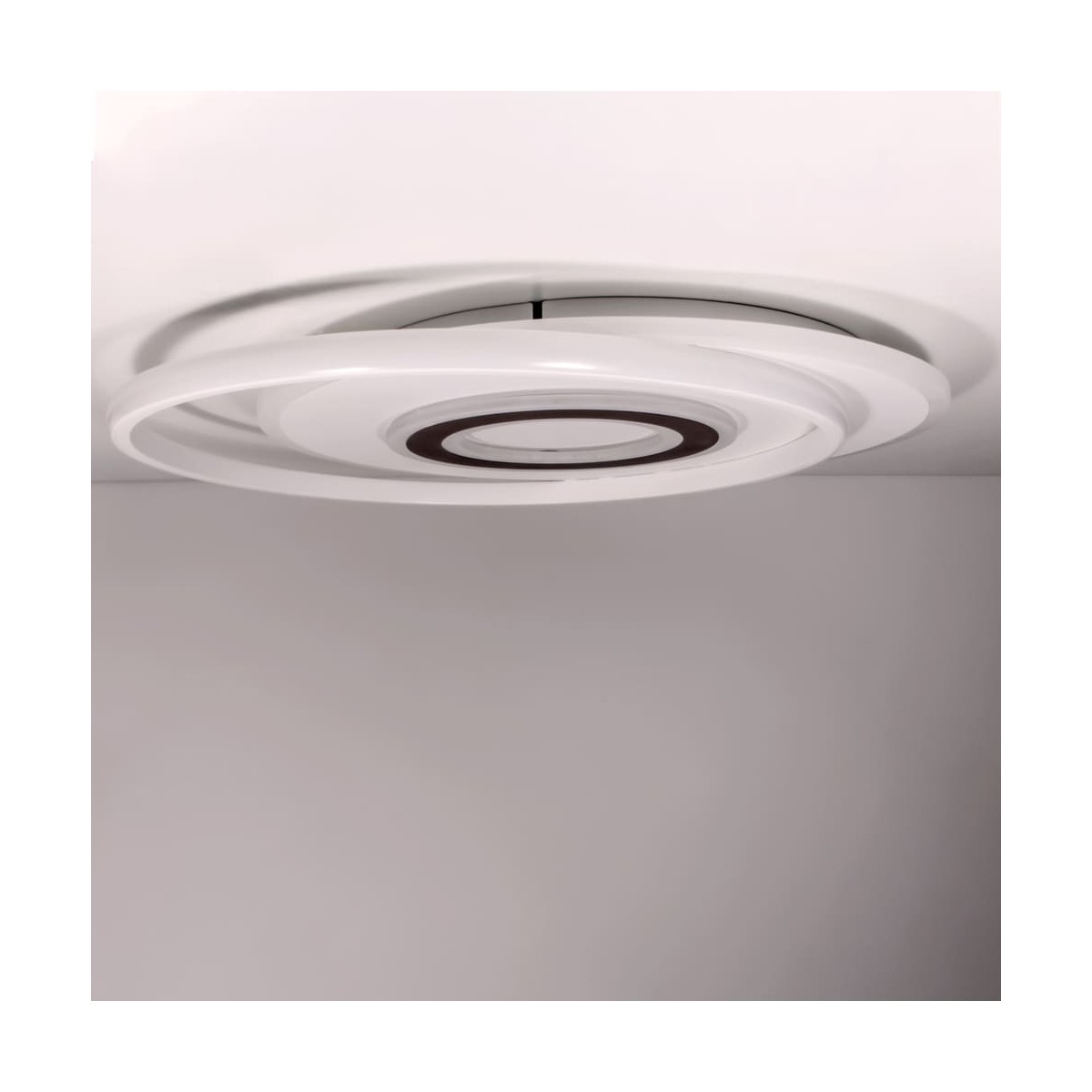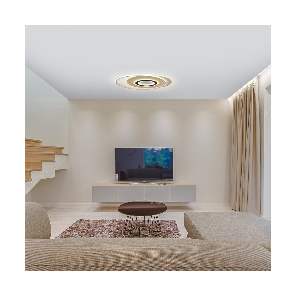 Plafón LED decorativo formado por diferentes aros superpuestos creando un diseño geometrico. Iluminación LED integrada de 75W con cambio de temperatura CCT y regulable en intensidad con luz de noche, con función de memoria de encendido. Incluye mando que funciona con pilas 2xAAA.