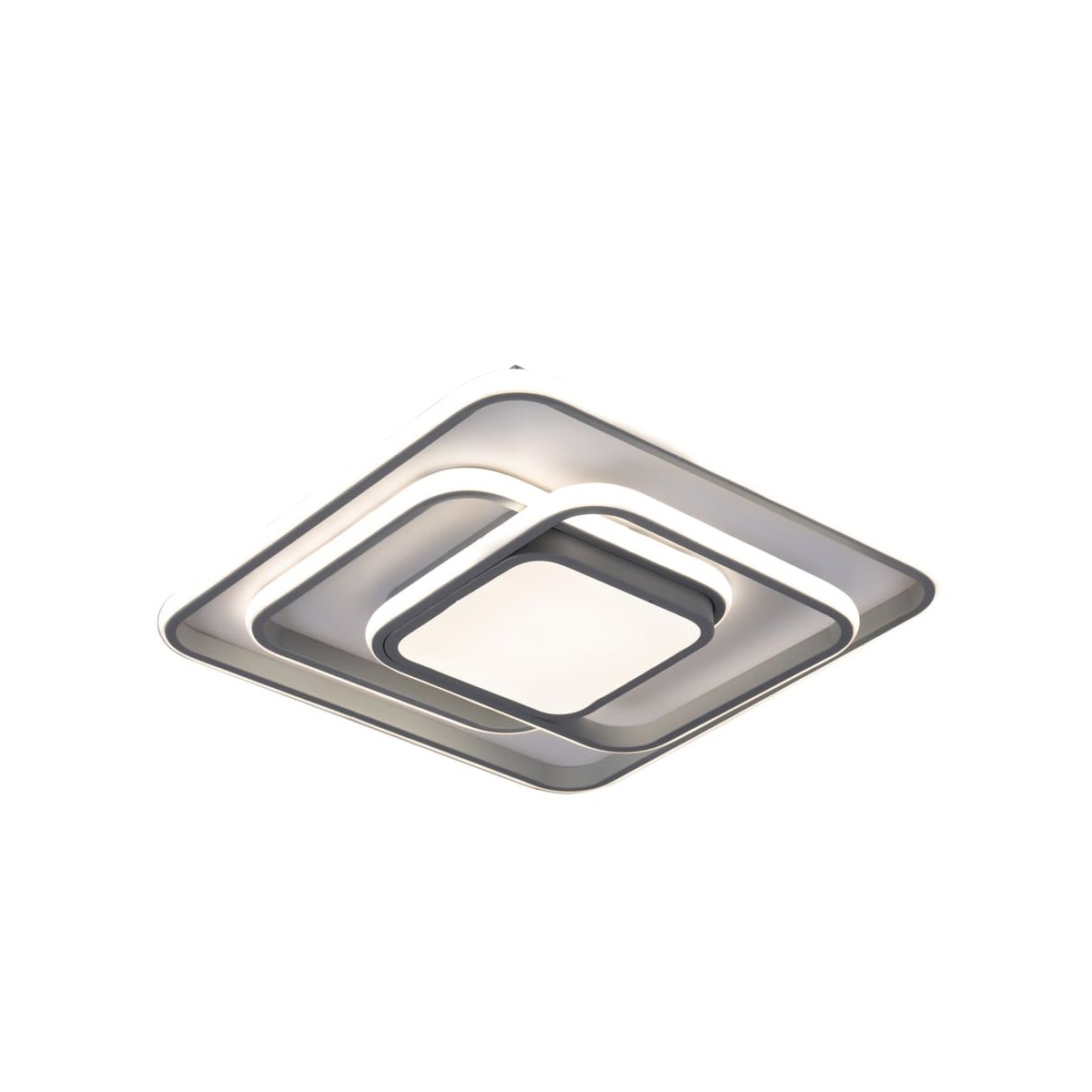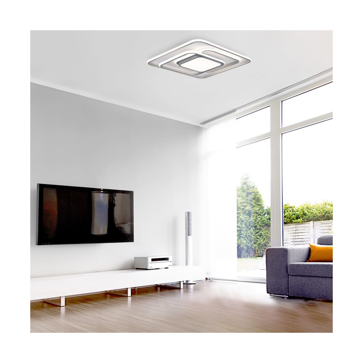 Plafón LED decorativo cuadrado con iluminación led integrada de tres temperaturas. La estructura del plafón permite crear, con sus tiras de iluminación, diferentes ambientes de iluminación. Con el mando incluido, además de ajustar el tono de luz puede regularse la intensidad y encenderse y apagarse. Además, dispone de modo noche de iluminación y función memoria para recuperar la última iluminación configurada.
