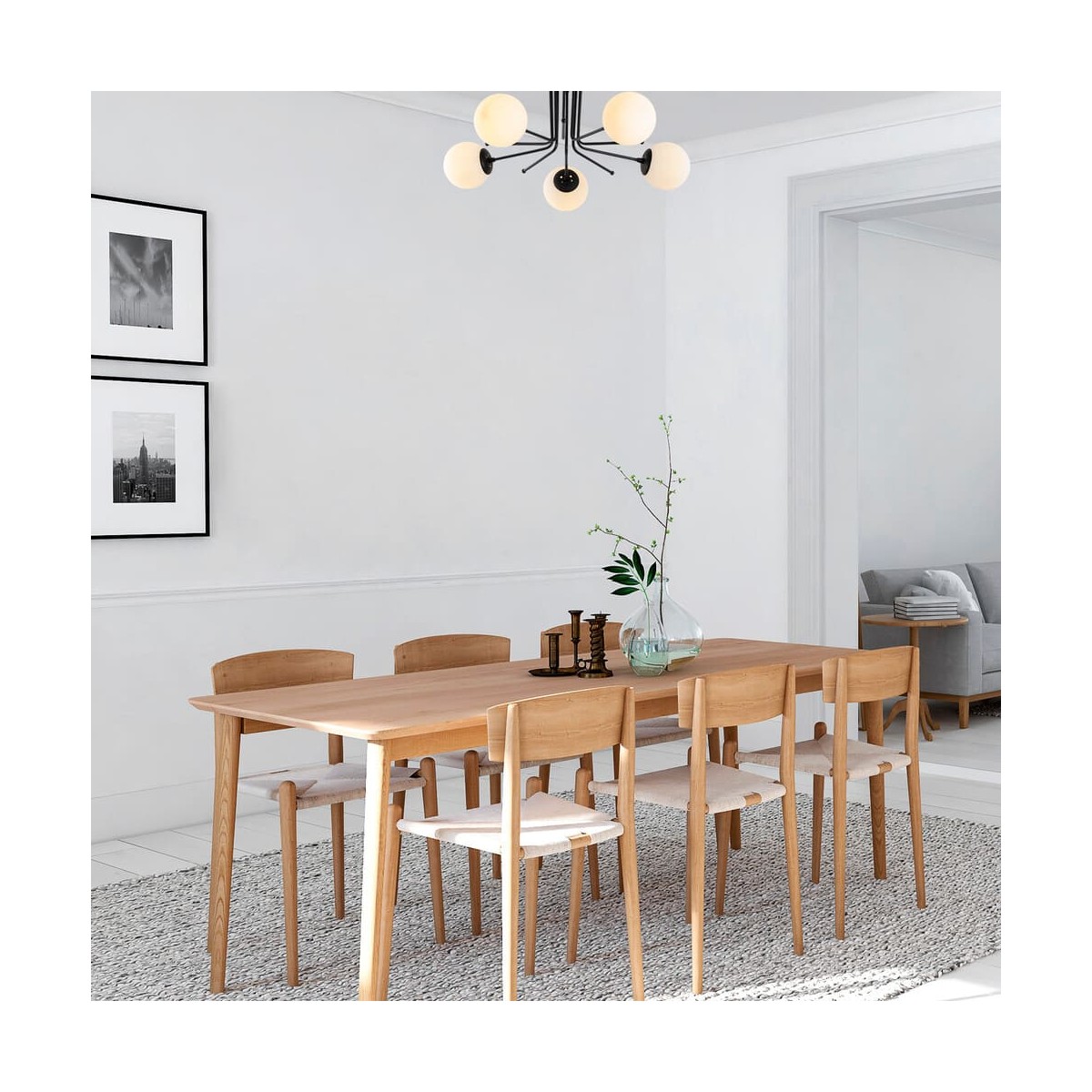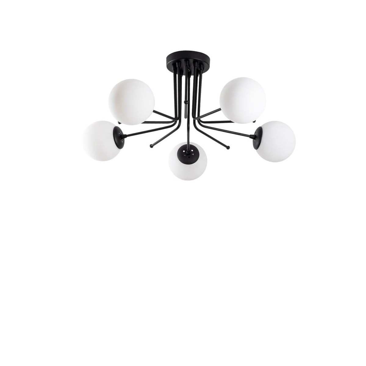 Plafón de techo decorativo de cinco luces con cuerpo metálico lacado en negro y tulipas de cristal blanco mate. Plafón de techo de 34 cm de alto estilo lámpara de araña. Para bombillas E27, no incluidas.