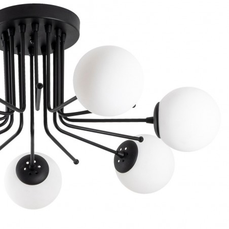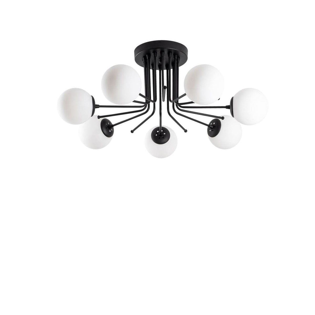 Plafón de techo decorativo de siete luces con cuerpo metálico lacado en negro y tulipas de cristal blanco mate. Plafón de techo de 34 cm de alto estilo lámpara de araña. Para bombillas E27, no incluidas.