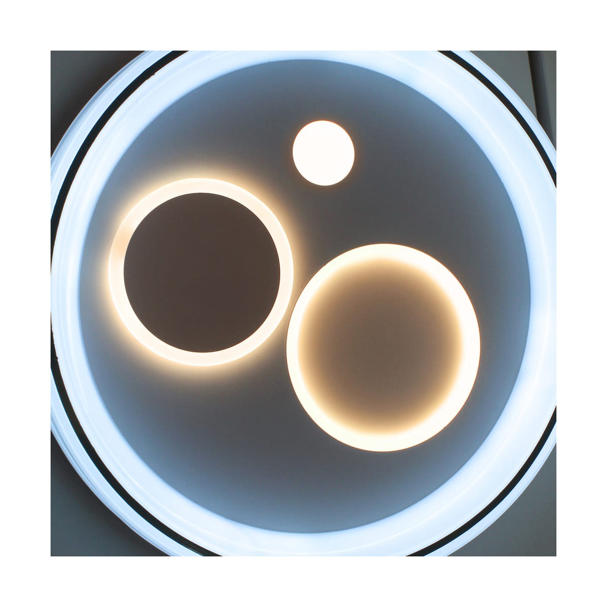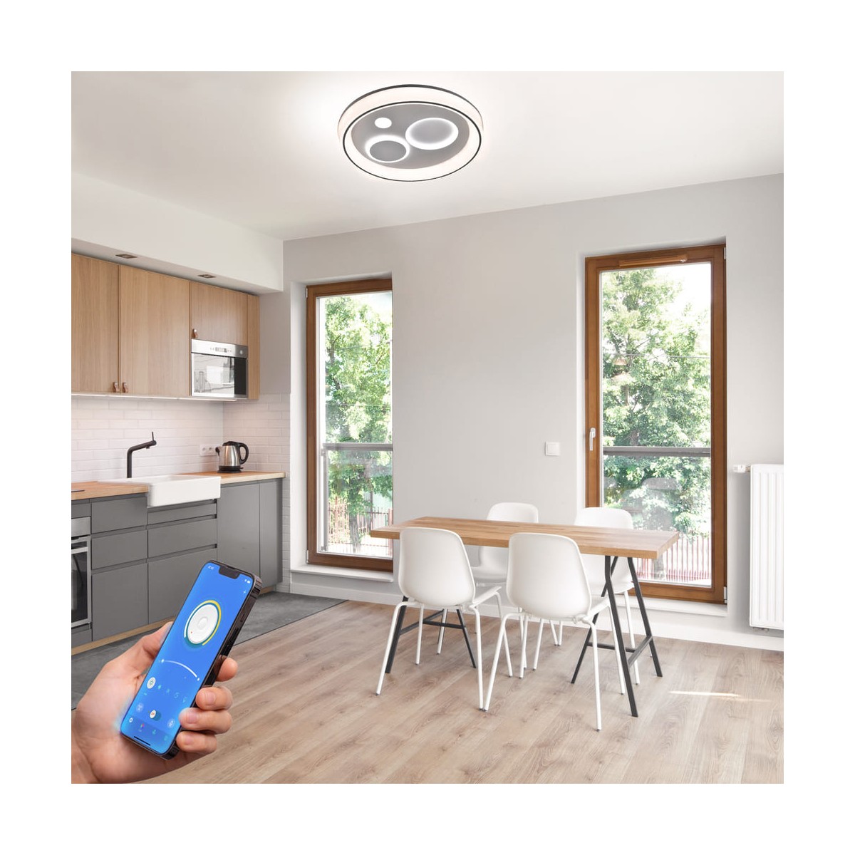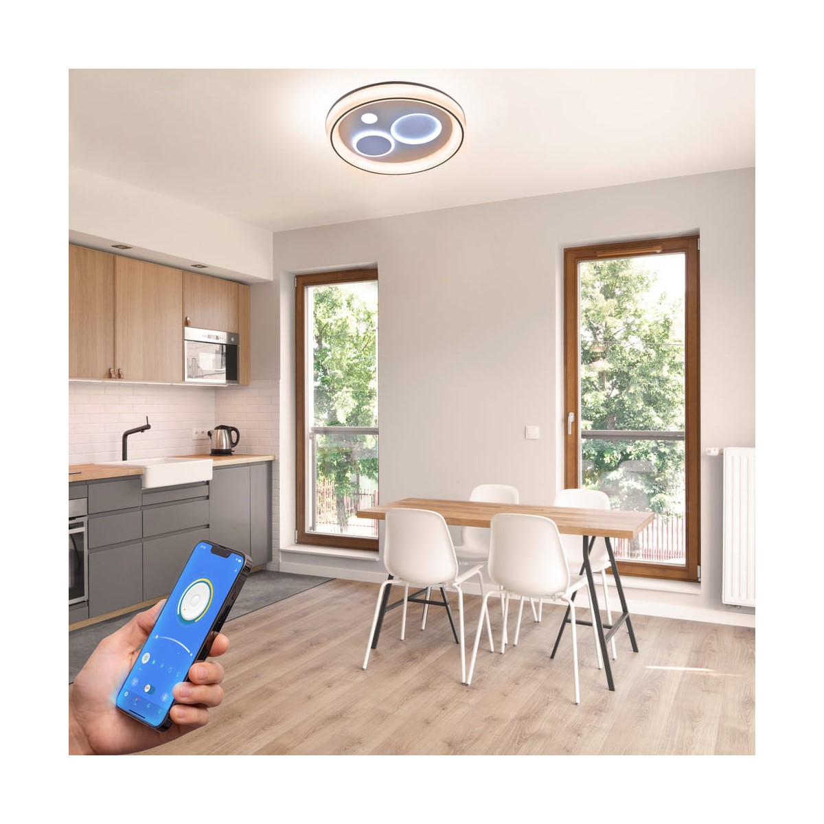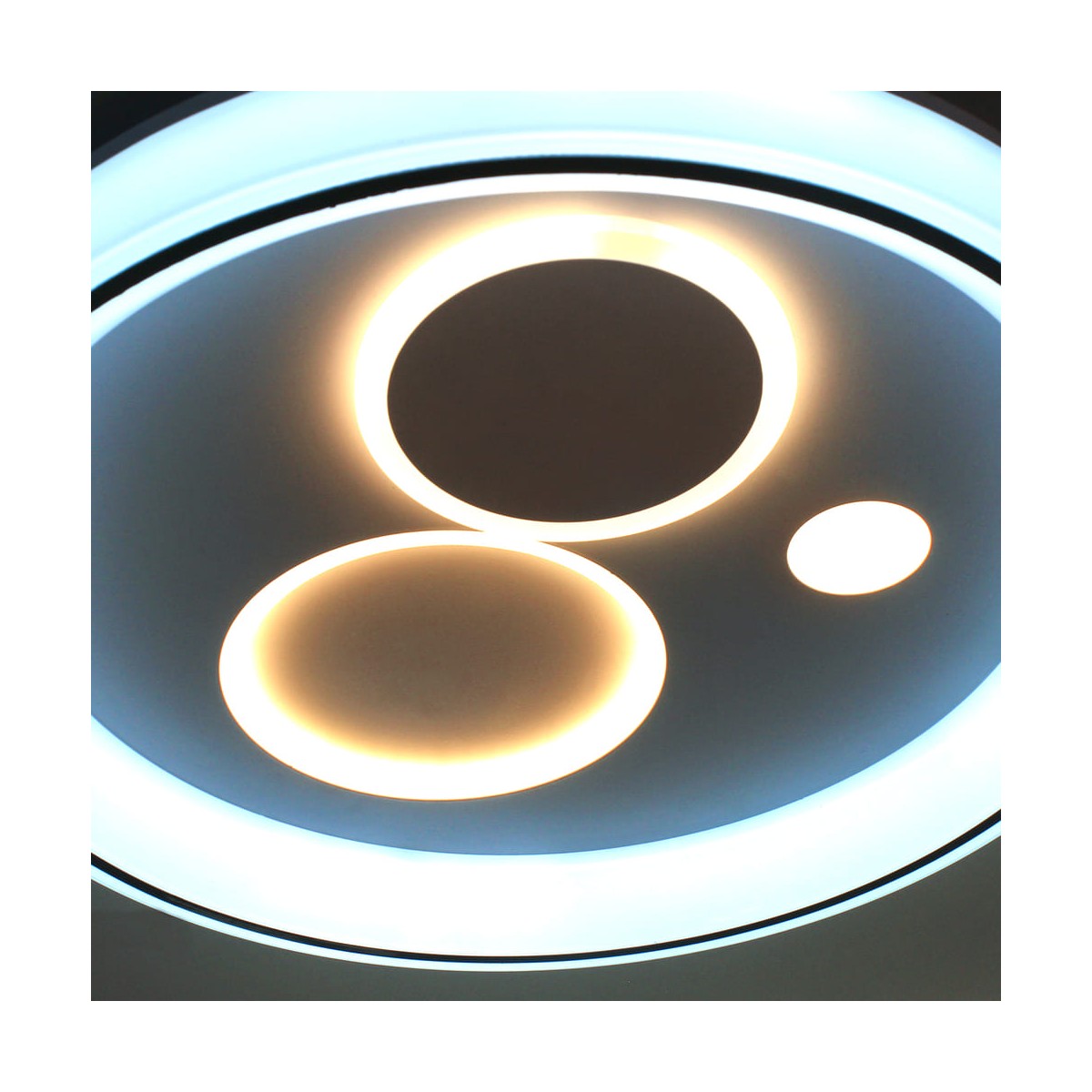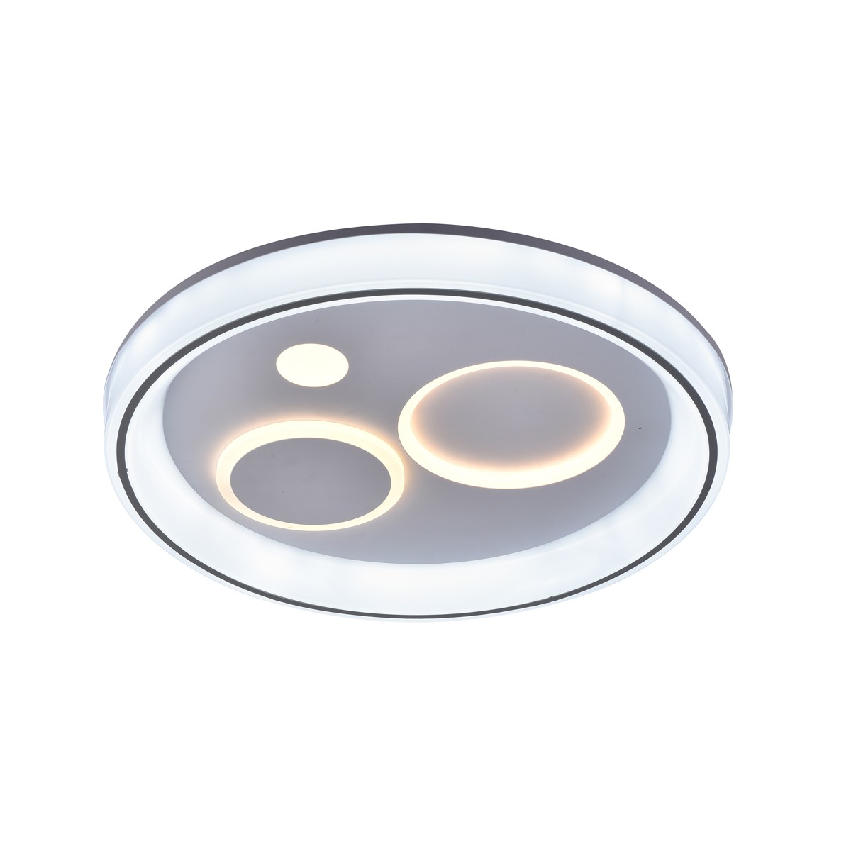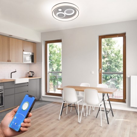 Plafón de techo decorativo smart con tres tonos de luz. Tanto desde la App móvil como desde el mando incluido puedes regular la intensidad y el color de la luz y poner el modo noche configurado por defecto. Cuenta con función memoria para recuperar la última iluminación configurada.