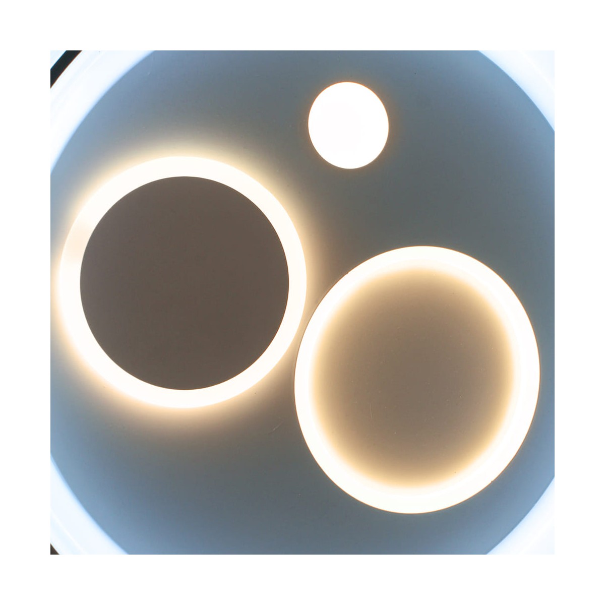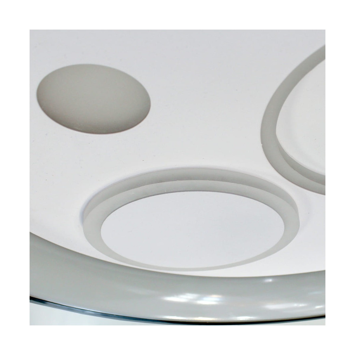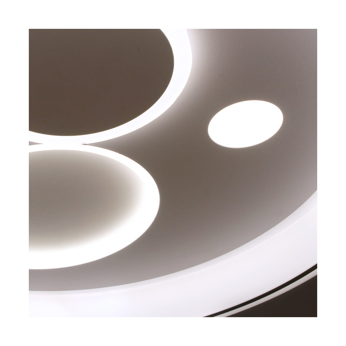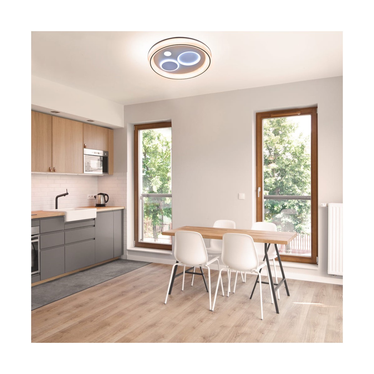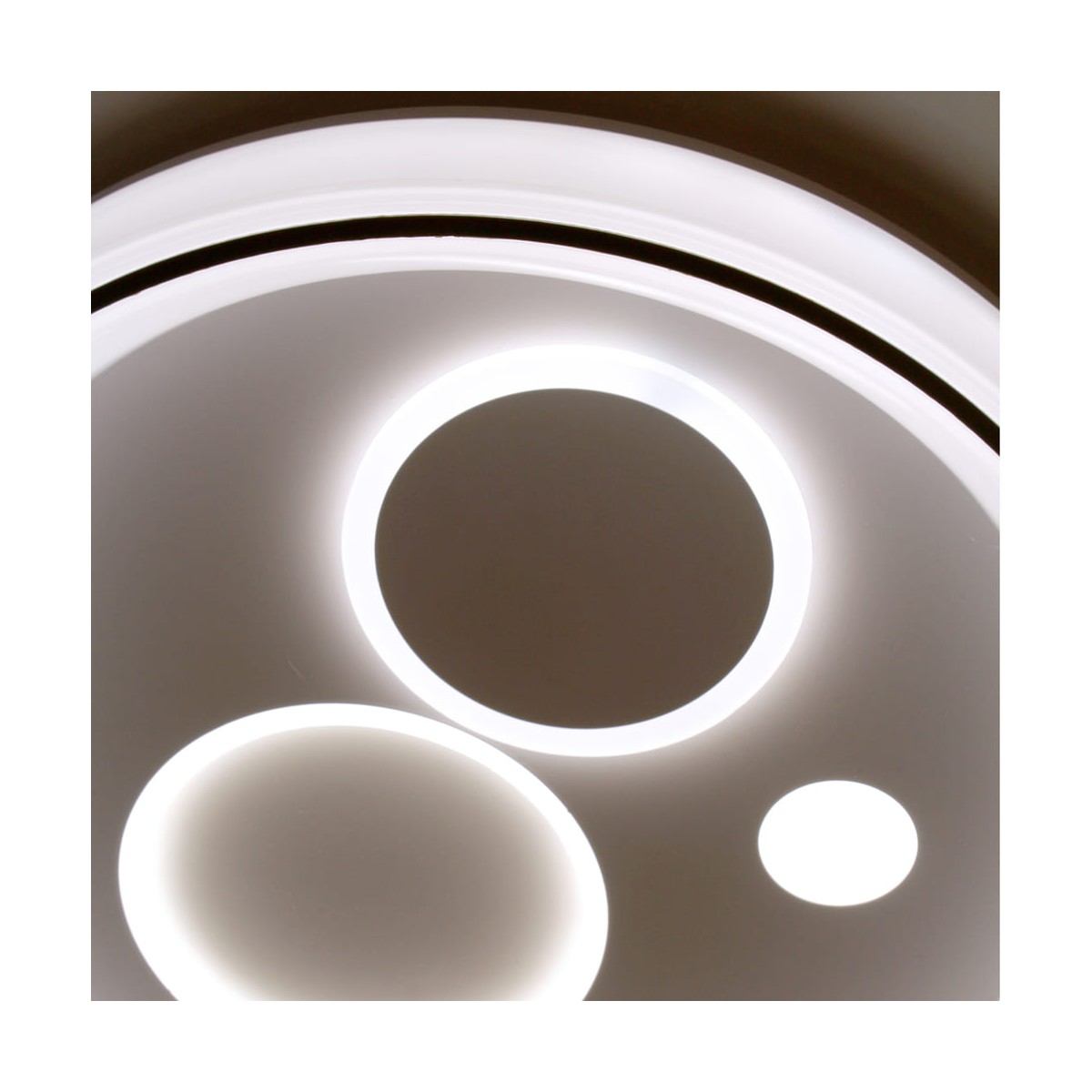 Plafón de techo decorativo smart con tres tonos de luz. Tanto desde la App móvil como desde el mando incluido puedes regular la intensidad y el color de la luz y poner el modo noche configurado por defecto. Cuenta con función memoria para recuperar la última iluminación configurada.