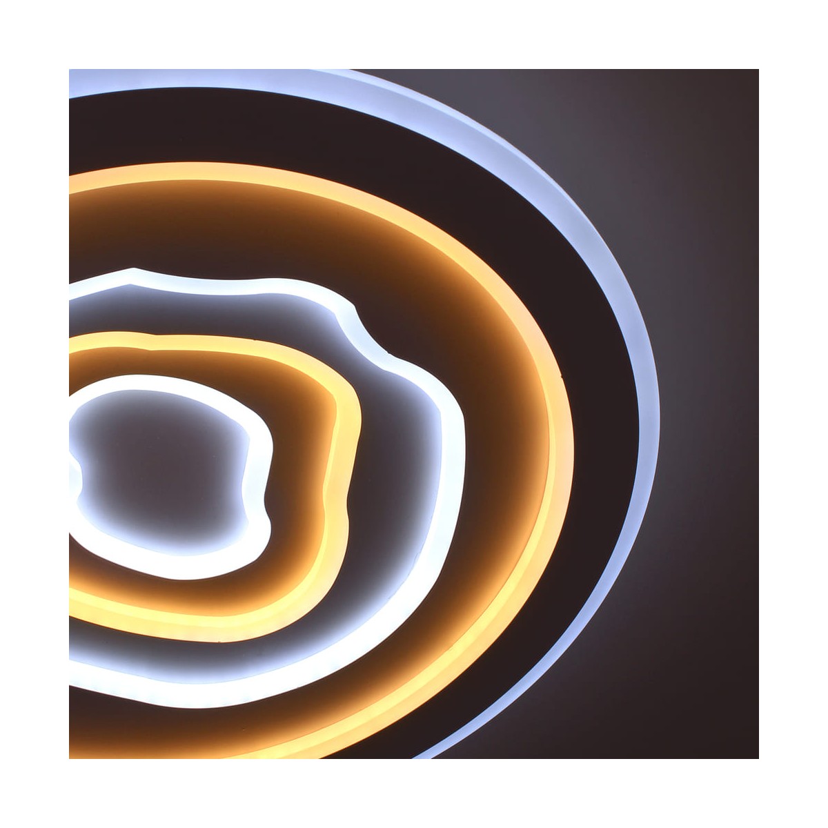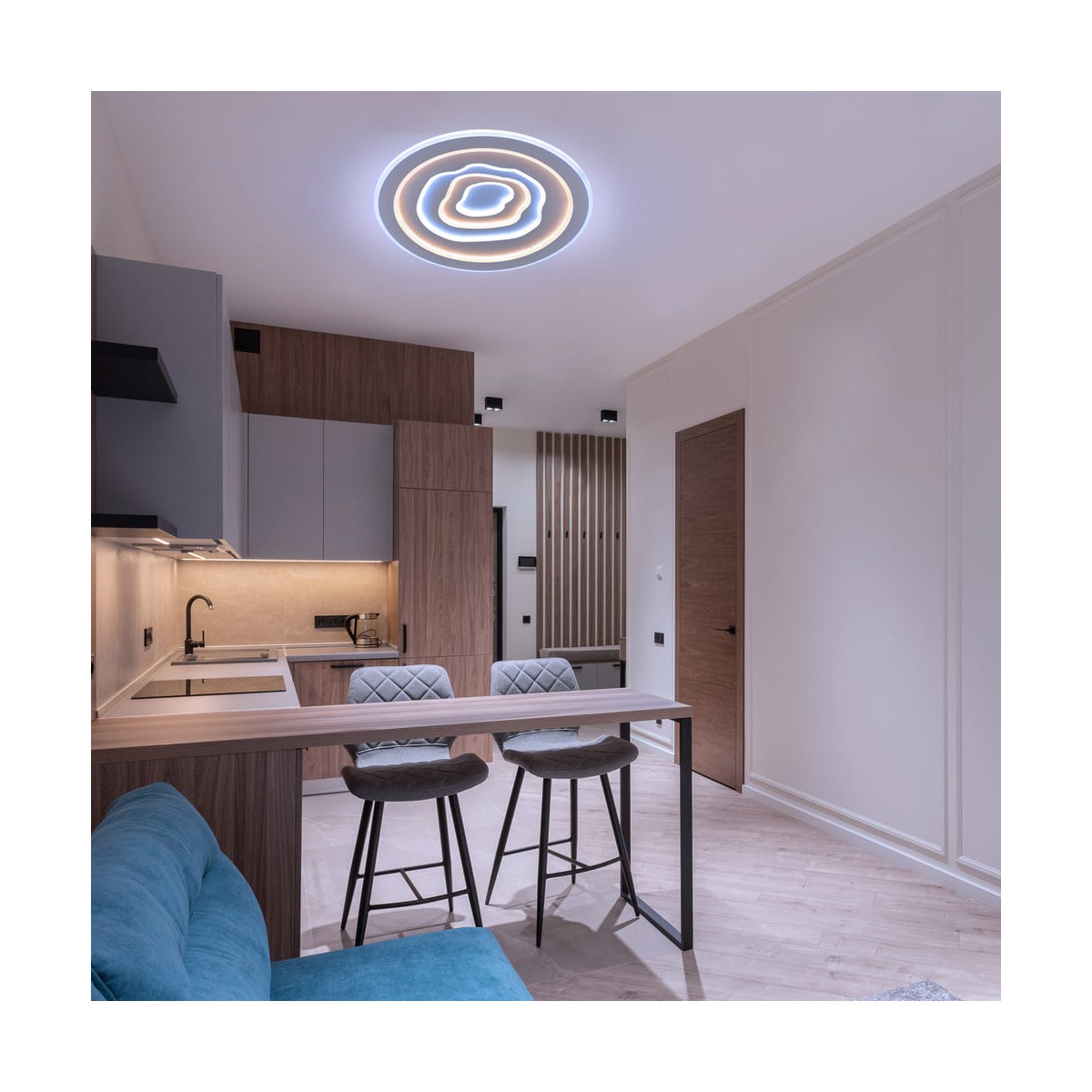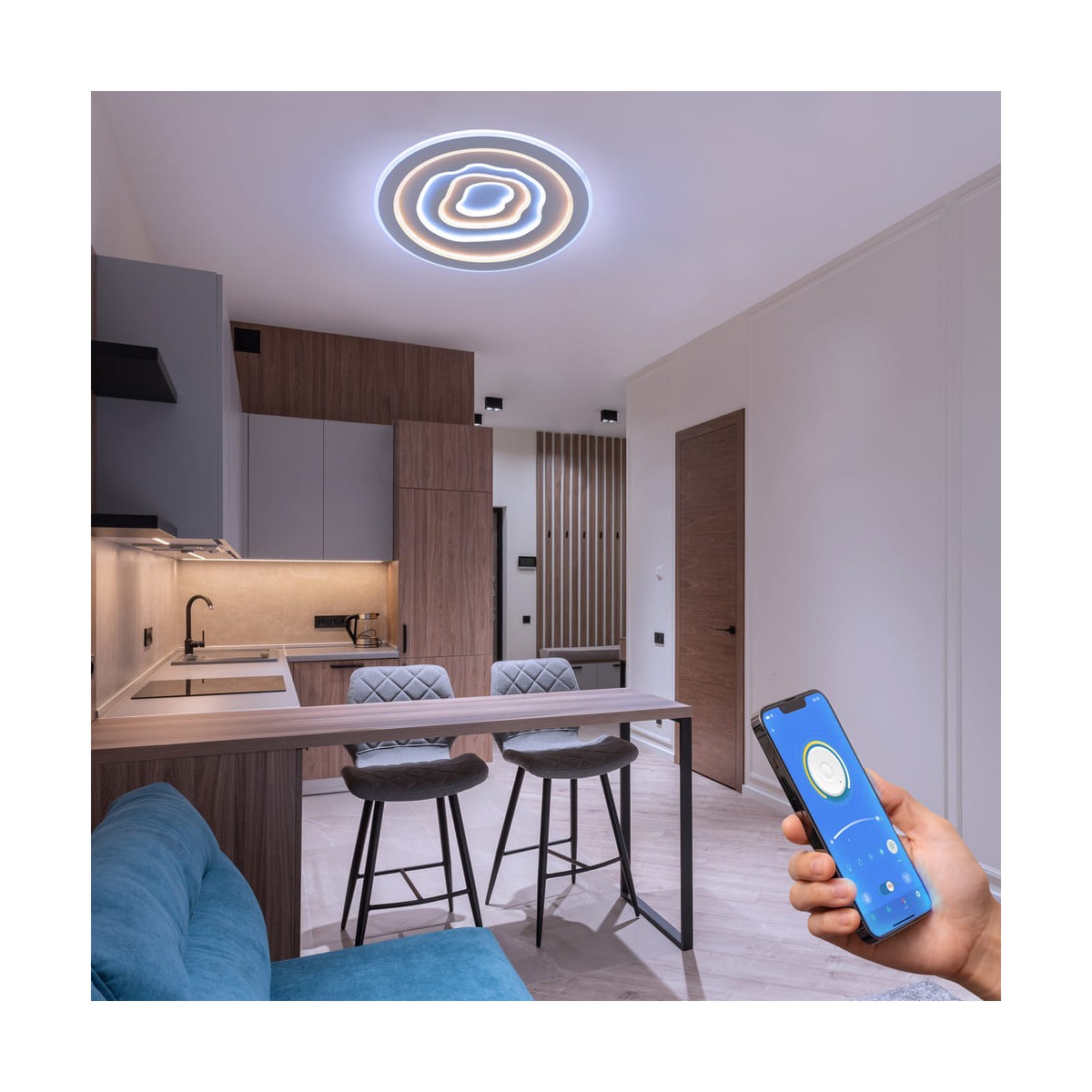 Plafón de techo decorativo smart con tres tonos de luz. Tanto desde la App móvil como desde el mando incluido puedes regular la intensidad y el color de la luz y poner el modo noche configurado por defecto. Cuenta con función memoria para recuperar la última iluminación configurada.