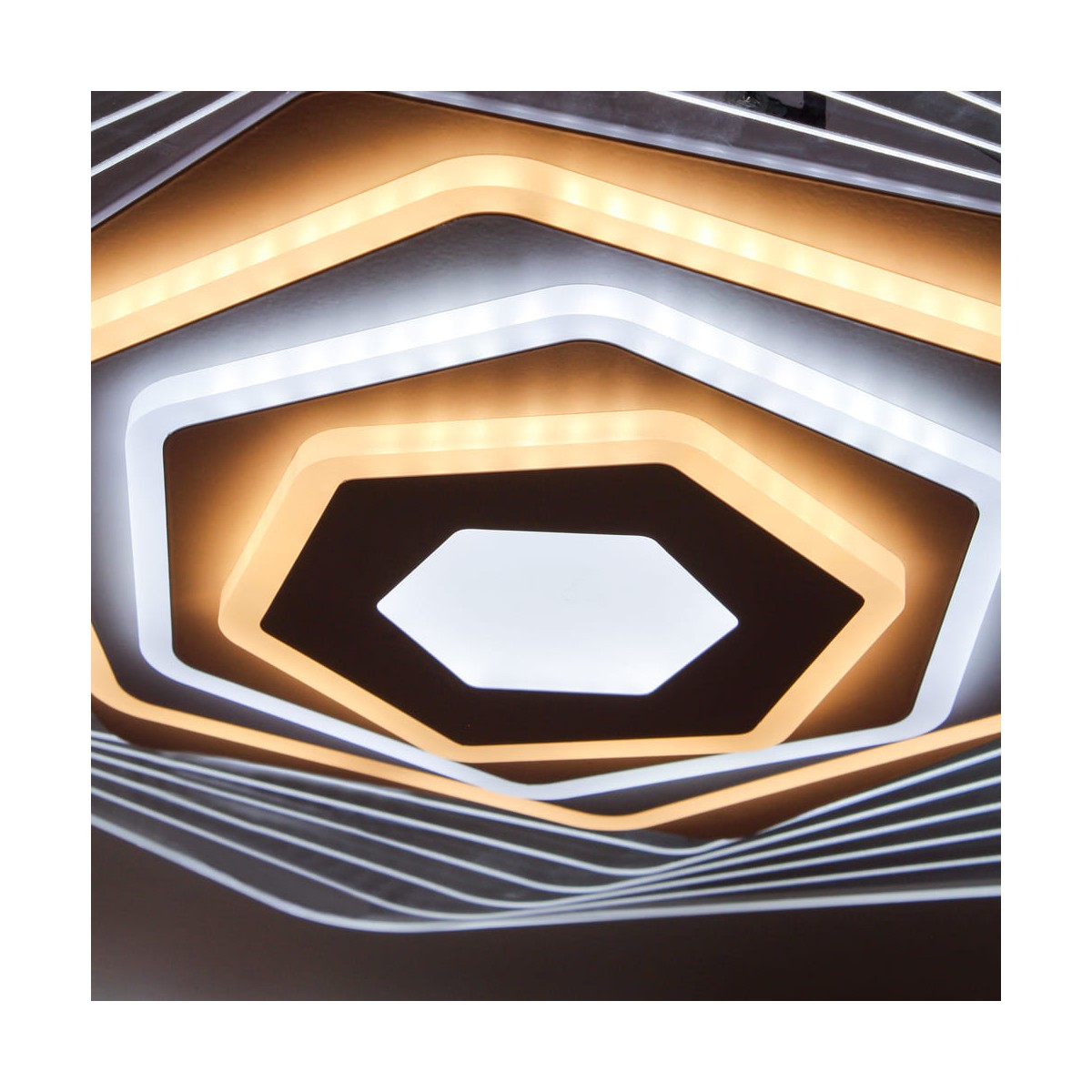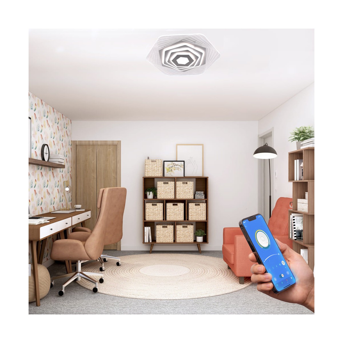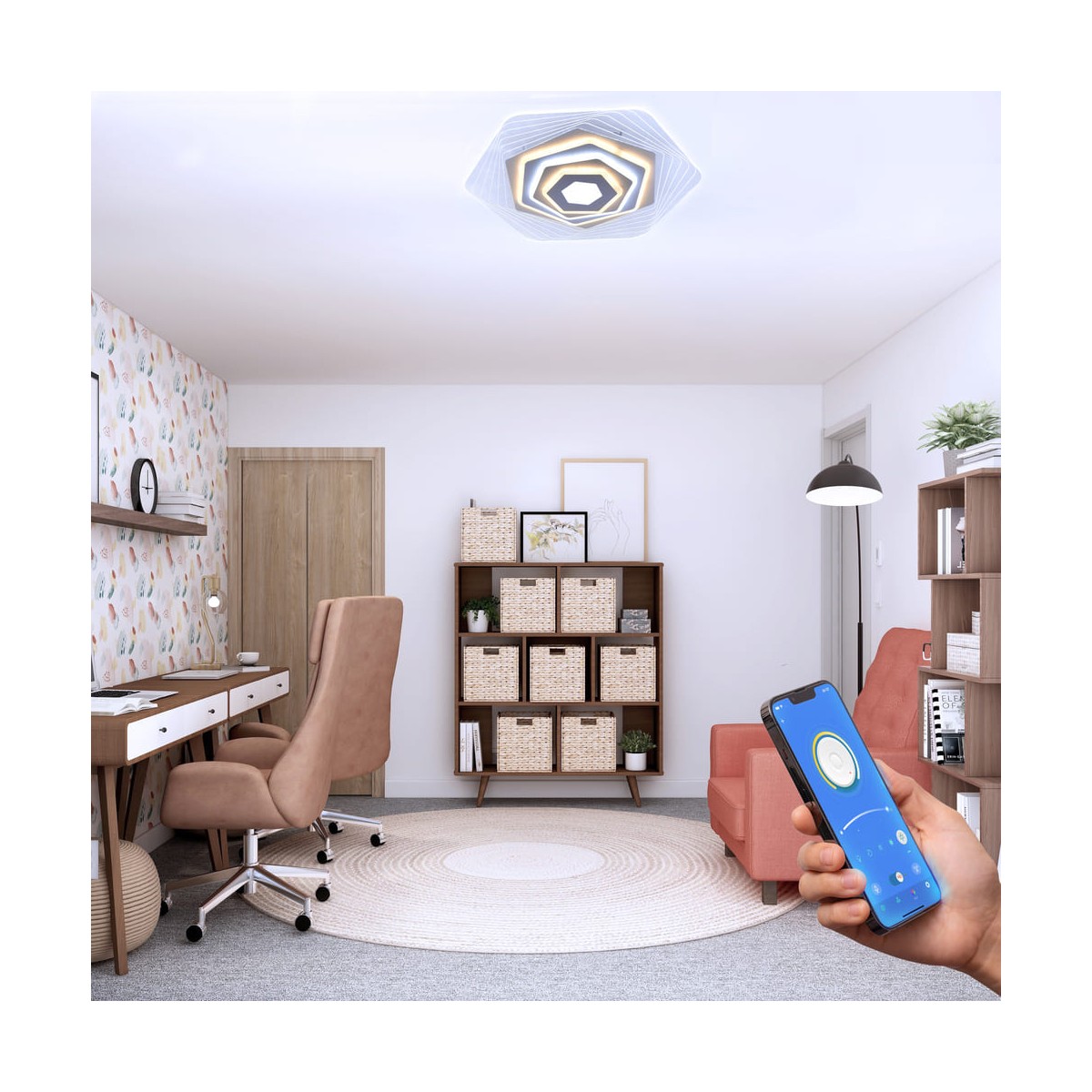 Plafón de techo decorativo smart con tres tonos de luz. Tanto desde la App móvil como desde el mando incluido puedes regular la intensidad y el color de la luz y poner el modo noche configurado por defecto. Cuenta con función memoria para recuperar la última iluminación configurada.