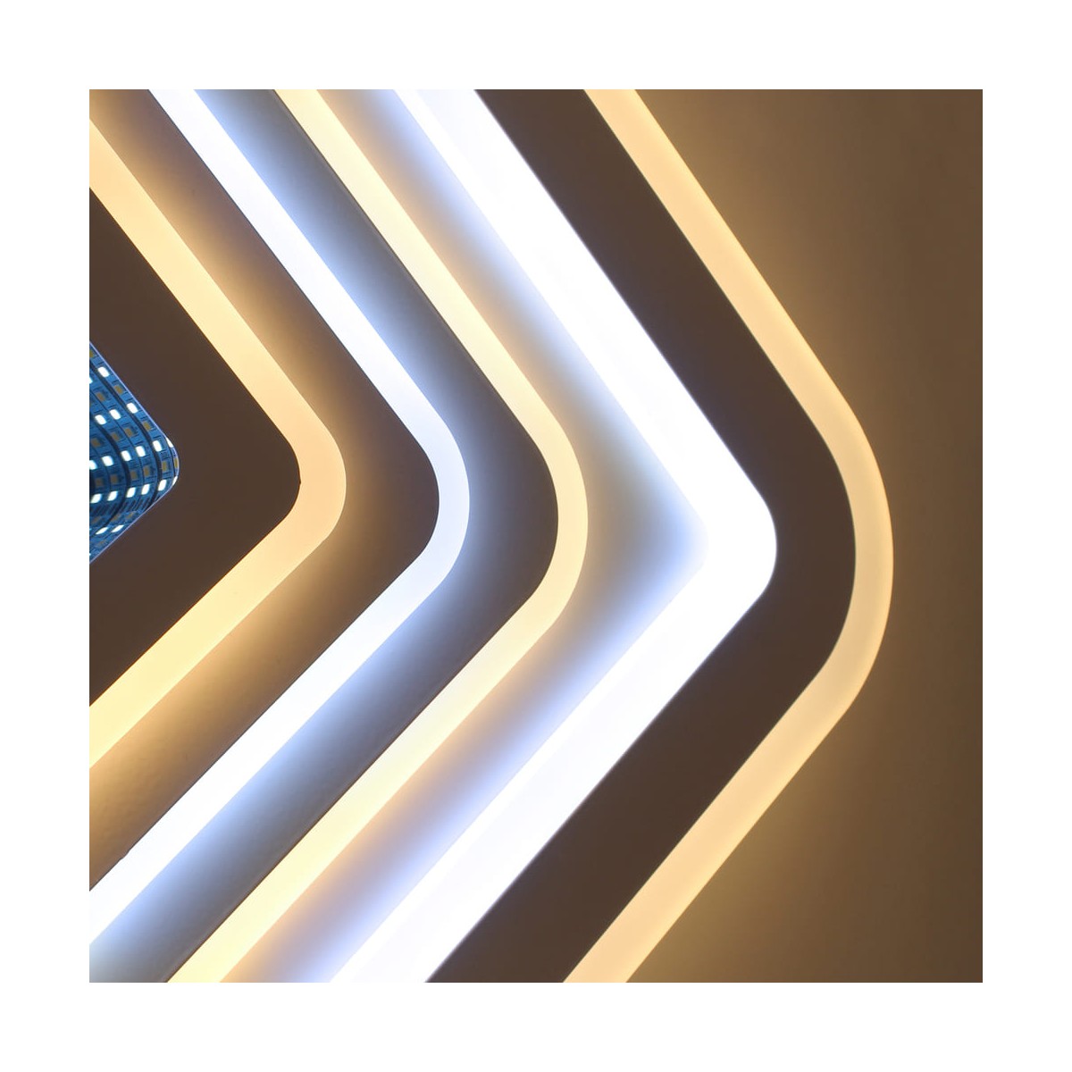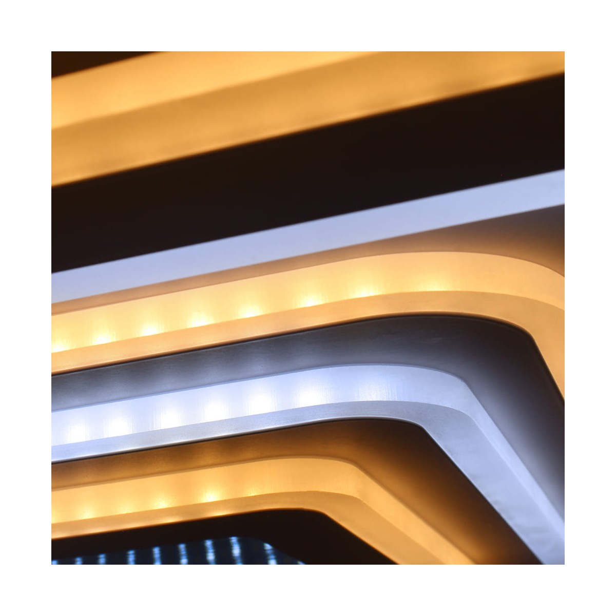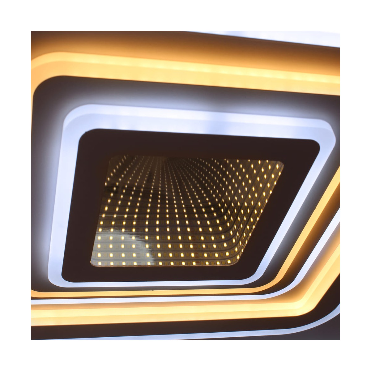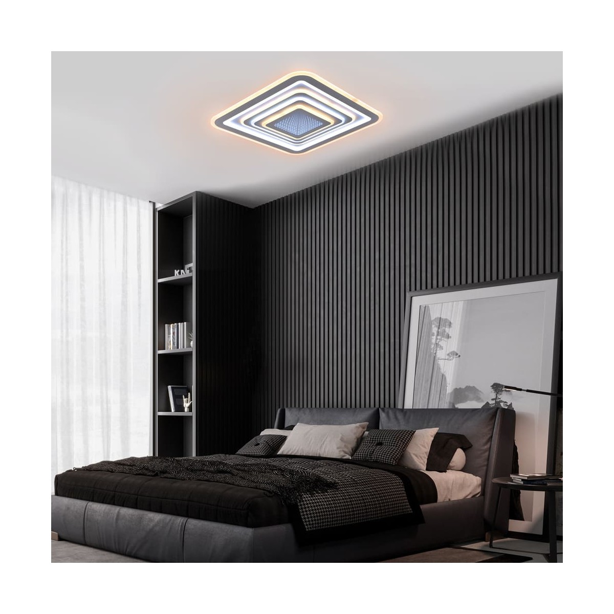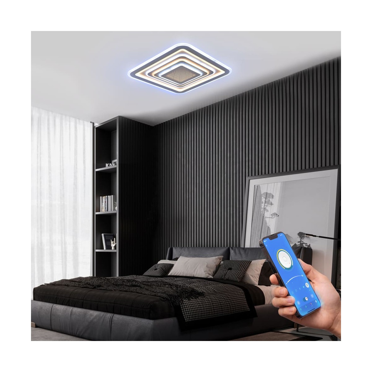 Plafón de techo decorativo smart con tres tonos de luz. Tanto desde la App móvil como desde el mando incluido puedes regular la intensidad y el color de la luz y poner el modo noche configurado por defecto. Cuenta con función memoria para recuperar la última iluminación configurada. El centro del plafón es un espejo con efecto 3D.