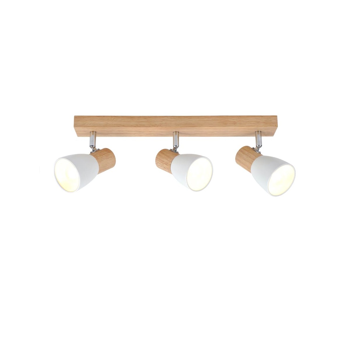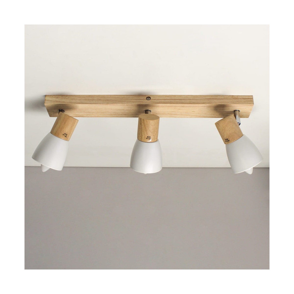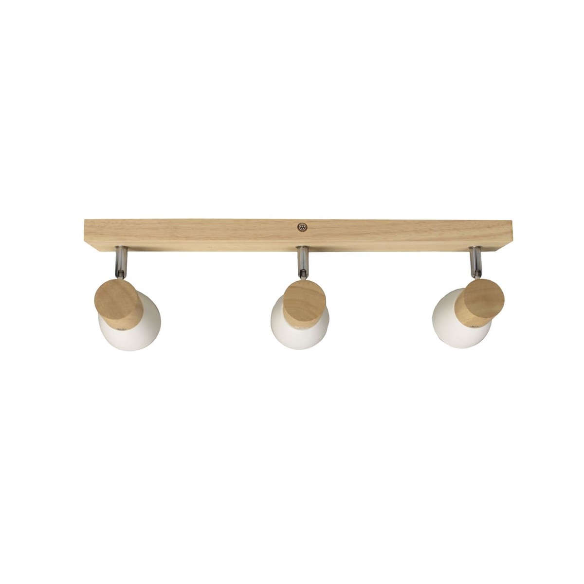 Plafón de techo decorativo con tres focos de aluminio para bombillas E14, no inlcuidas. Los focos, lacados en blanco, pueden moverse para dirigir la luz al punto deseado. La base de 67x6 cm es de madera natual.