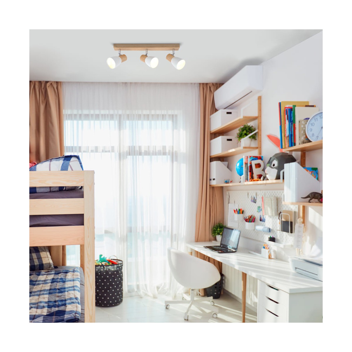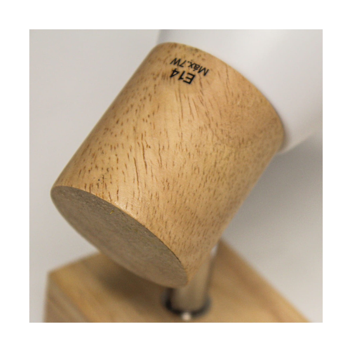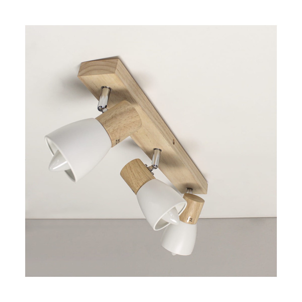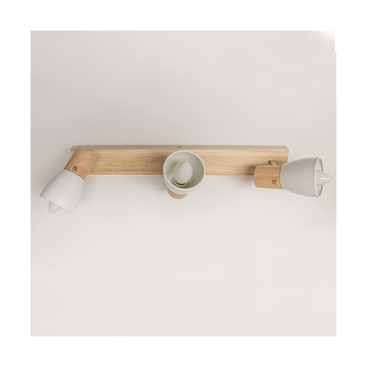 Plafón de techo decorativo con tres focos de aluminio para bombillas E14, no inlcuidas. Los focos, lacados en blanco, pueden moverse para dirigir la luz al punto deseado. La base de 67x6 cm es de madera natual.