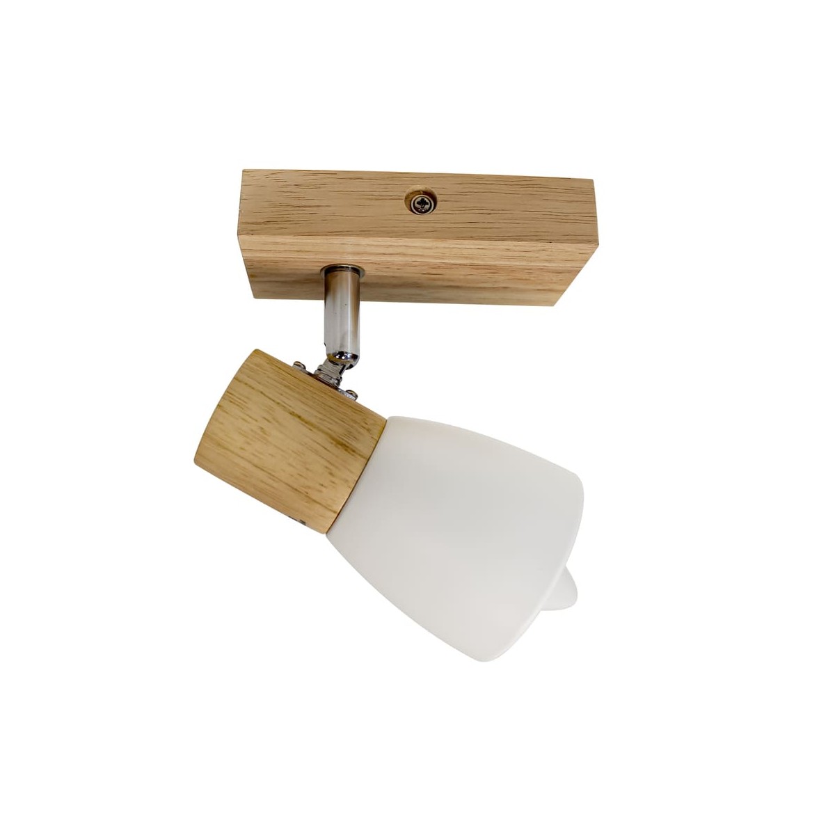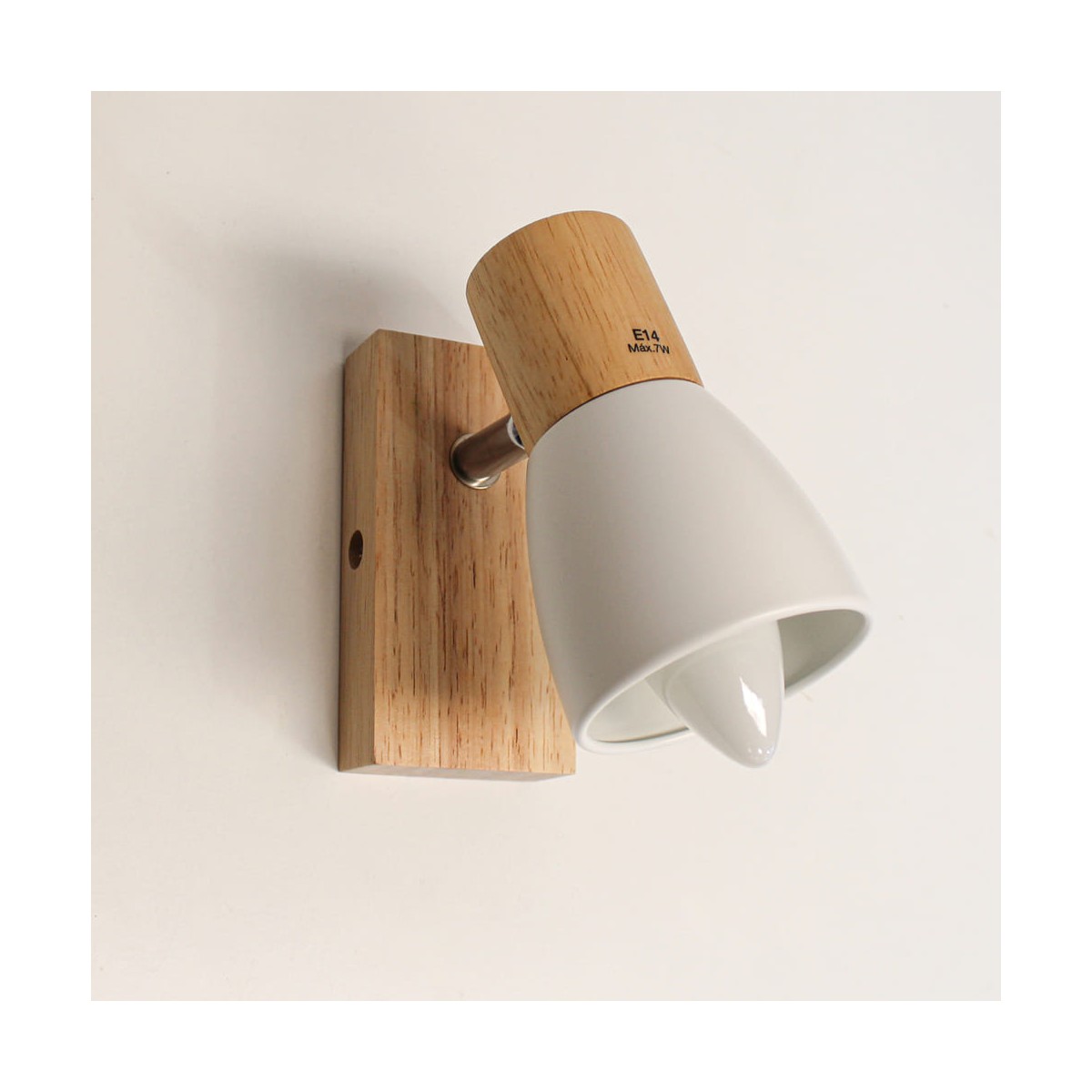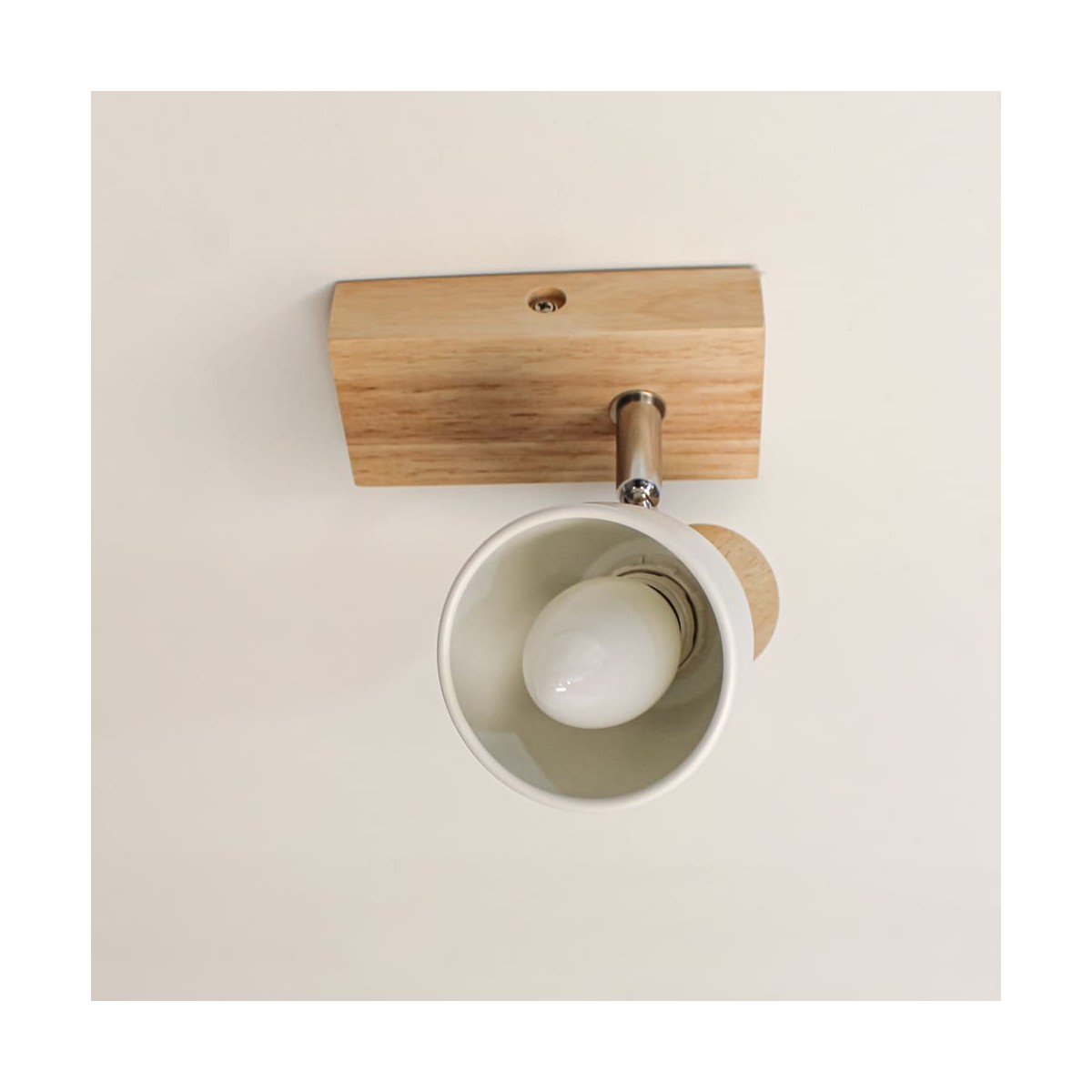 Plafón de techo decorativo con un foco de aluminio para bombillas E14, no inlcuidas. El foco, lacados en blanco, pueden moverse para dirigir la luz al punto deseado. La base de 67x6 cm es de madera natural.