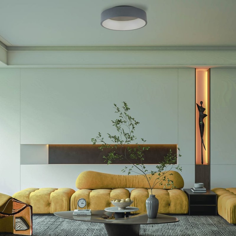 Plafón de techo LED Silen con tres temperaturas de color. Plafón circular con mando a distancia para regular la intensidad de lúmenes y el tono de color de la iluminación. Fabricado en aluminio de color gris antracita y difusor de policarbonato. Cuenta con memoria de encendido de modo que al apagarlo y encenderlo se mantiene la última configuración de luz.
