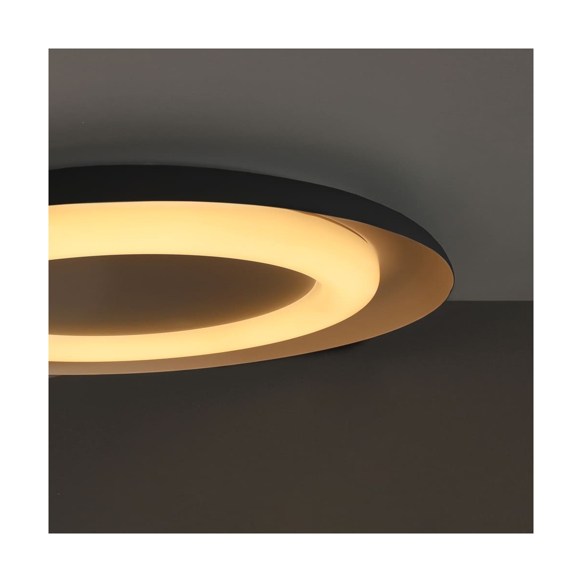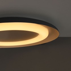 Plafón de techo LED Jara de 48W. Plafón de forma circular con difusor de aro, perfecto para instalar como fuente de luz principal de una estancia. Fabricado en aluminio, con la parte interior de color blanco y el exterior de color negro. Iluminación LED en tono cálido (3000ºK) aportando una confortable luz en la estancia que decidas iluminar.