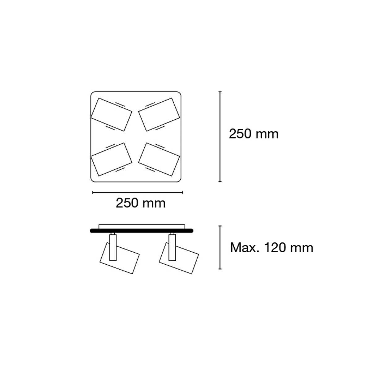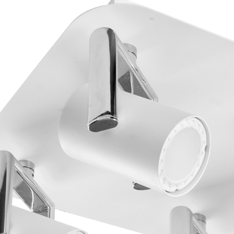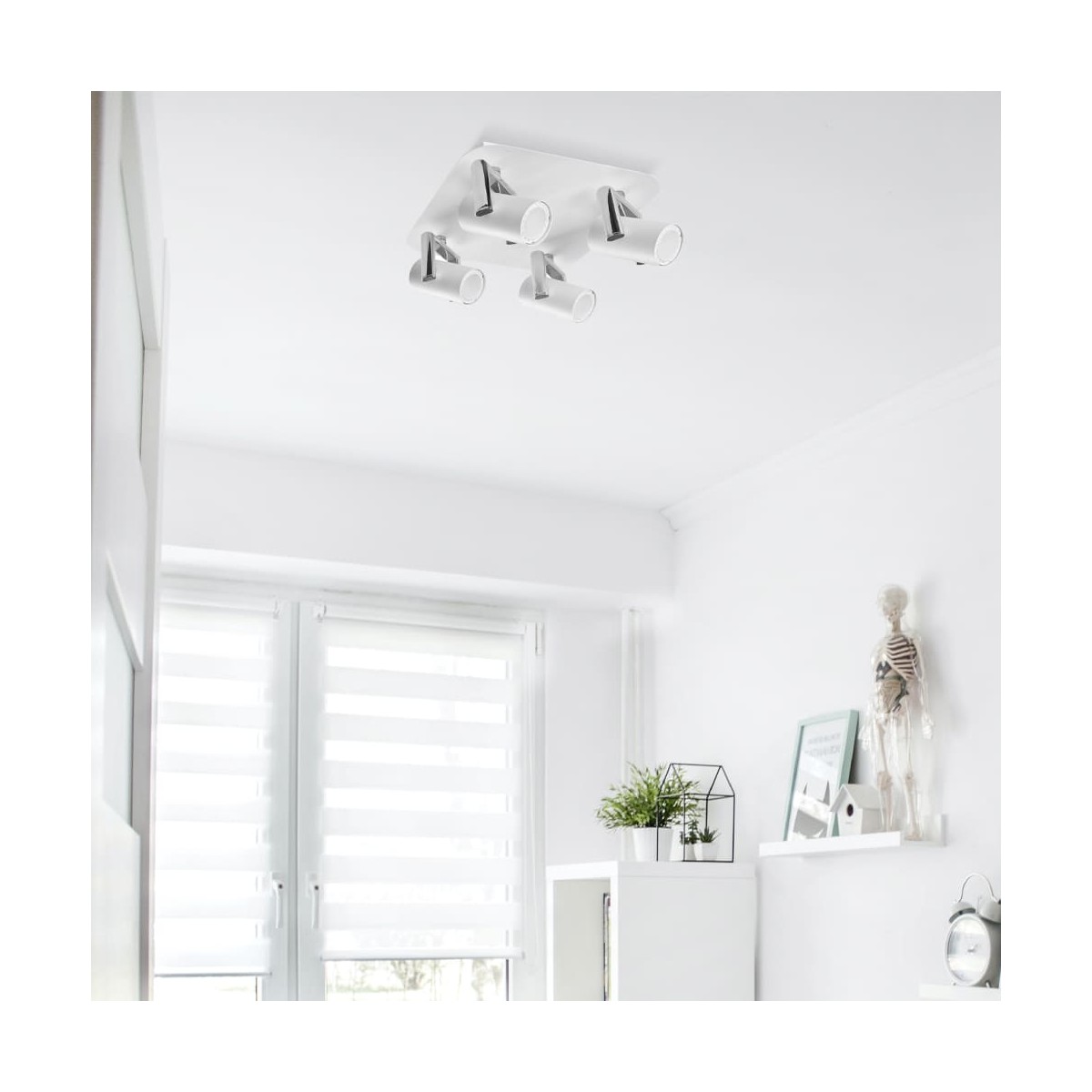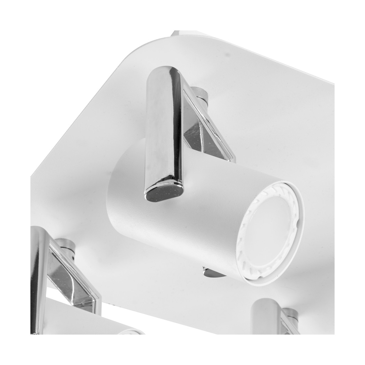 Plafón de techo con focos orientables. Plafón de techo fabricado en aluminio de color blanco. Los focos son orientables y funcionan con bombillas GU10 (no incluidas). Ideal para la iluminación funcional de espacios de interior como casas, tiendas y negocios.