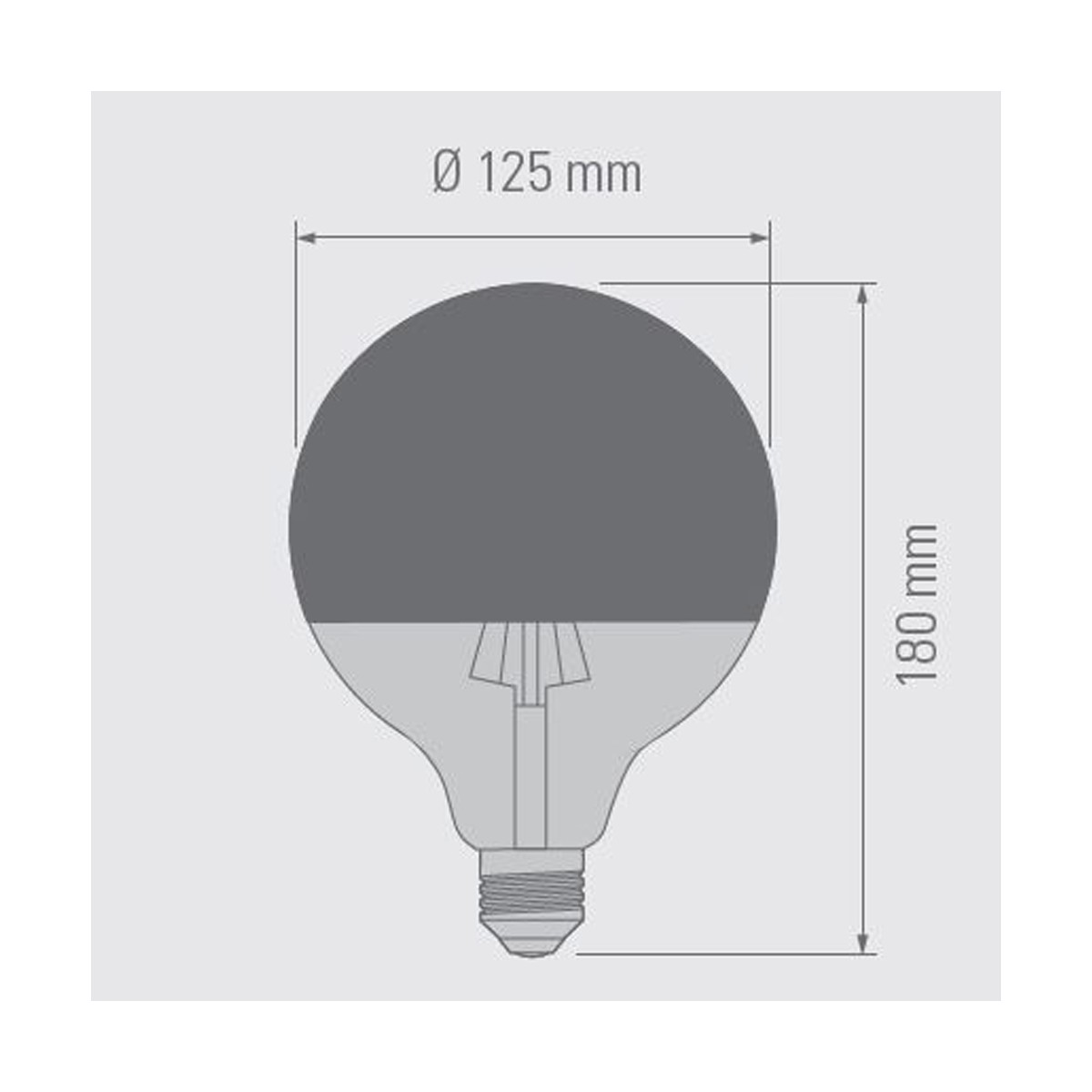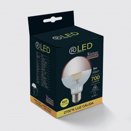 Bombilla LED de 125 mm de díametro con media cúpula de efecto espejo en acabado cobre. Bombilla vintage de filamentos LED, que cuenta con luz cálida de 2700K, 6w de potencia y 700 lúmenes.