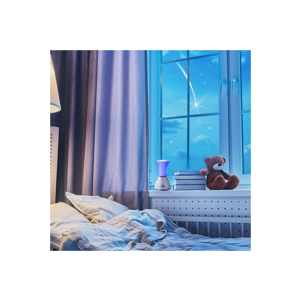 Lámpara de sobremesa con iluminación LED RGB (7 colores) y altavoz HI-FI. Baja potencia de 3W, 220v, 280Lm. Puede usarse como luz quitamiendos. Ranura para tarjetas microSD y conexión para reproductor externo. Incluye USB y cable de conexión auxiliar. 30000 horas de uso. Dimensiones 13x13x24 mm.