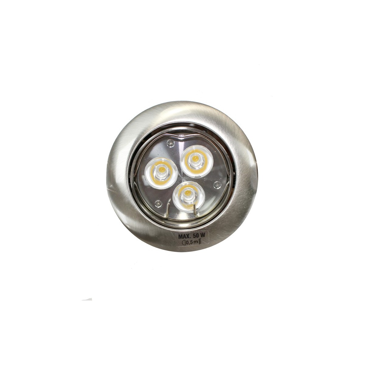 Empotrable redondo basculante de Ø85mm de diámetro. Tiene un ángulo de basculación de 35°. La rosca mide Ø75mm. Con estructura de aluminio y acabado níquel. Clase de protección III. Incluye una bombilla LED GU10 de 6W (=50W halógena), 3000°K de 230V y 50Hz. Se conecta directamente a red.