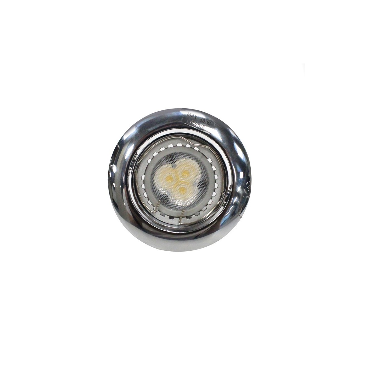 Empotrable redondo basculante de Ø85mm de diámetro. Tiene un ángulo de basculación de 35°. La rosca mide Ø75mm. Con estructura de aluminio y acabado cromo. Clase de protección III. Incluye una bombilla LED GU10 de 7W (=50W halógena), 3000°K de 220-230V y 50/60Hz. Se conecta directamente a red.