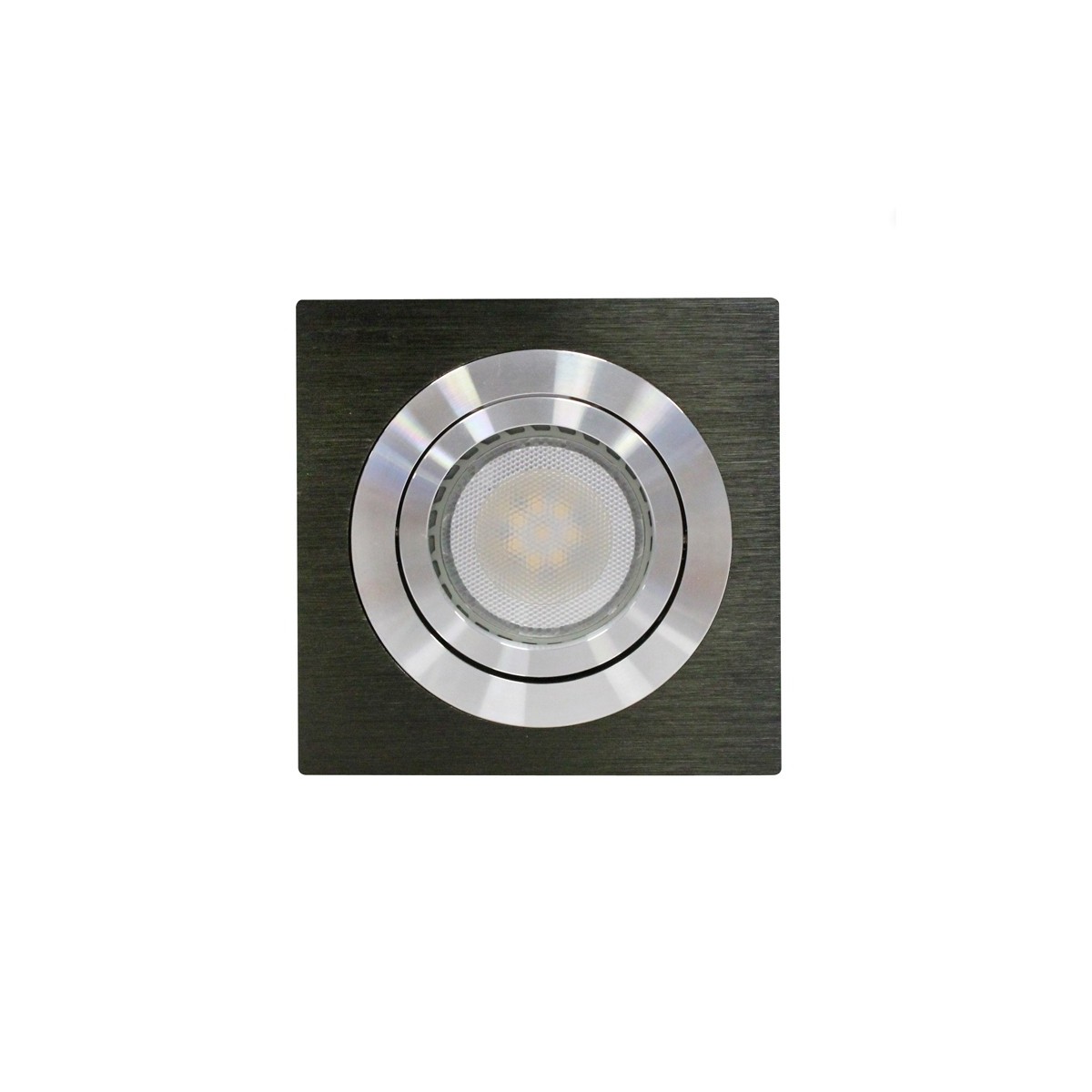 Empotrable cuadrado de 90x90mm con estructura de aluminio y acabado en negro con un ángulo de basculación de 30°. Rosca redonda de Ø80mm. Clase de protección III, IP20.