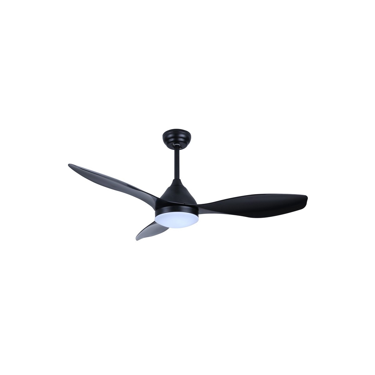 Ventilador de techo silencioso de color negro. Iluminación LED integrada regulable en intensidad y en temperatura de color. Con motor DC silencioso funciona con 6 velocidades diferentes e incluye temporizador de 2h, 4h y 8h y función verano-invierno. Memoria de encendido con la última configuración de iluminación. Incluye mando a distancia para controlar ventilador e iluminación. Motor DC.