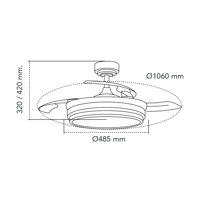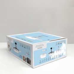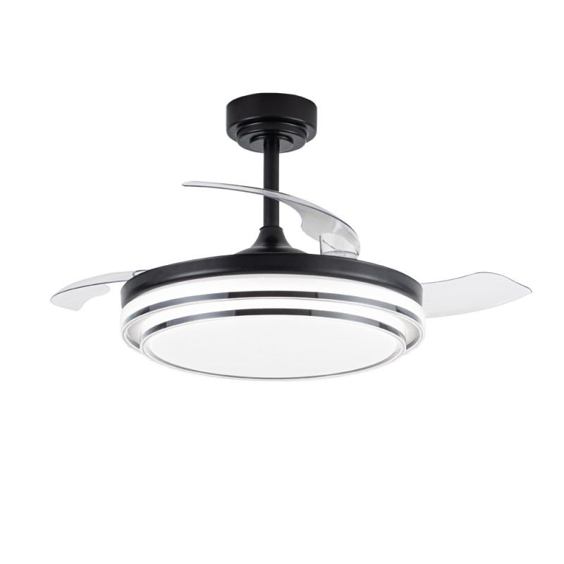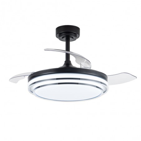 Ventilador de techo con aspas plegables Lander. Ventilador ultra silencioso con seis velocidades de giro, función inversa y temporizador. Tiene aspas retráctiles de modo que quedan recogidas sobre el motor cuando el ventilador no está en funcionamiento. Puedes regular el tono de color y dimar la intensidad de la iluminación con el mando a distancia. Ventilador de techo de color negro con aspas plegables transparente de PC. Recomendado para habitaciones de tamaño entre 13 y 20 m3.