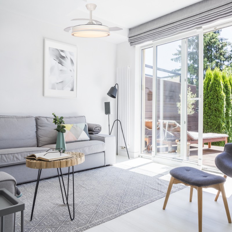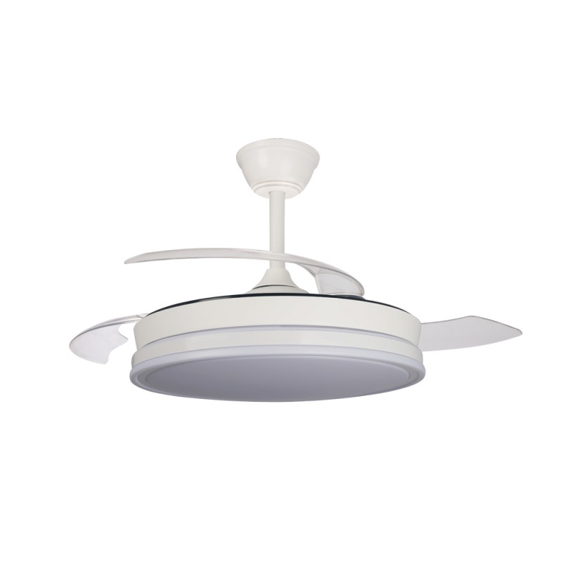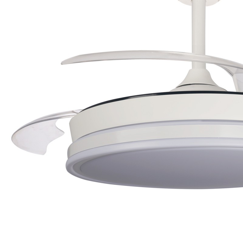 Ventilador silencioso para dormitorios. Ventilador de color blanco con aspas retráctiles diseñado especialmente para dormitorios y salones. Su motor DC de seis velocidades emite el mínimo de ruido cuando el ventilador está en funcionamiento. Cuenta con iluminación LED de bajo consumo y puede regularse con el mando a distancia de manera sencilla. Función inversa inverno verano, temporizador y memoria de color. Ventilador silencioso con aspas retráctiles.