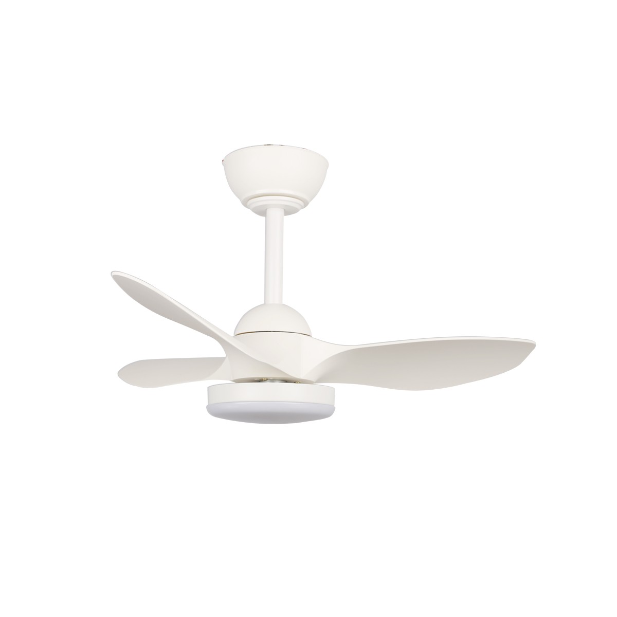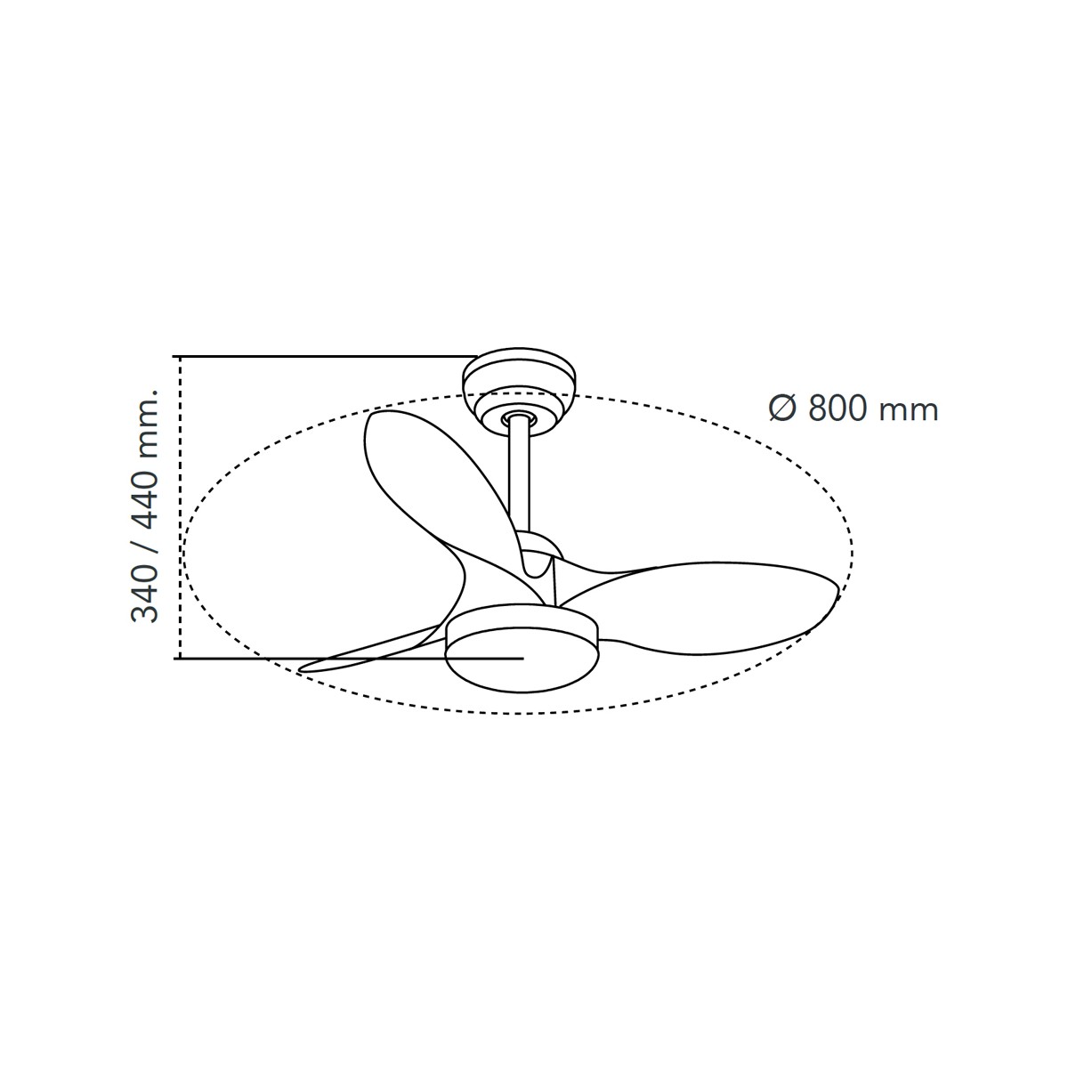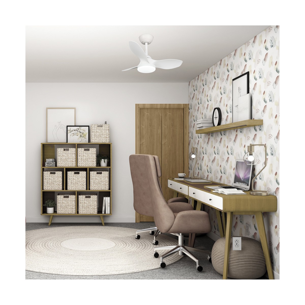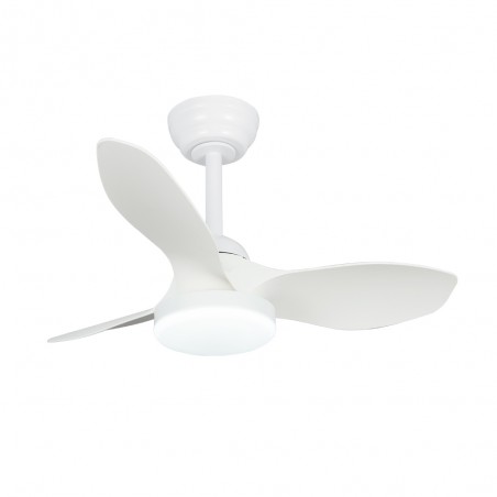 Ventilador de techo silencioso Stel Mini S. Iluminación LED integrada regulable en intensidad y en temperatura de color. Con motor DC silencioso funciona con 6 velocidades diferentes e incluye temporizador de 1-2-4h y función verano-invierno. Memoria de encendido con la última configuración de iluminación. Incluye mando a distancia para controlar ventilador e iluminación. Estilo moderno en color blanco con diámetro de 80 centímetros, diseñado para instalar en el techo de habitaciones y dormitorios pequeños.