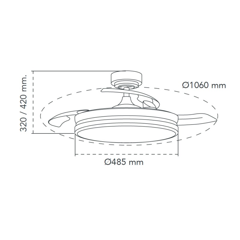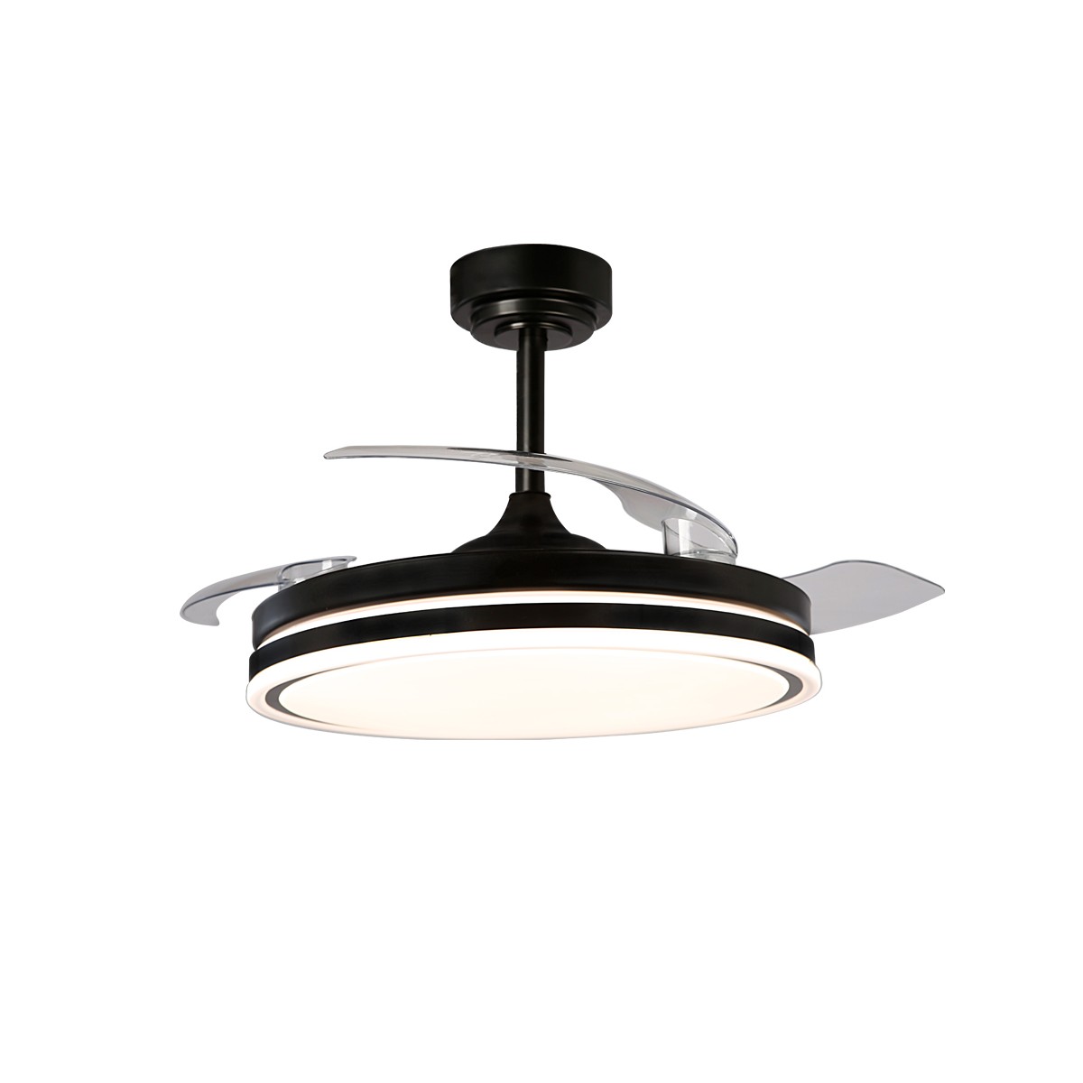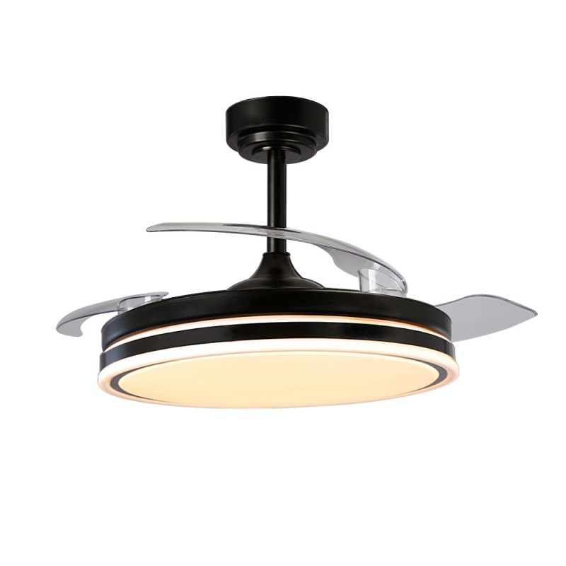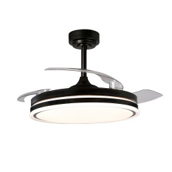 Ventilador de techo LED Moss con aspas retráctiles. Ventilador moderno de color negro con un práctico diseño que permite tanto aportar ventilación como iluminar la estancia. Lleva integrada iluminación LED dimmable en intensidad de lúmenes y tres temperaturas de color (3000-4000-6000K). Además, con el mando a distancia puedes seleccionar función brisa, un modo luz de noche o fijar el apagado del ventilador a las 2-4 horas. Motor DC ultrasilencioso con seis velocidades de giro y función inversa invierno verano. Ventilador de color negro y aspas transparentes.