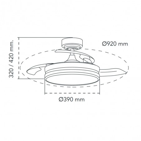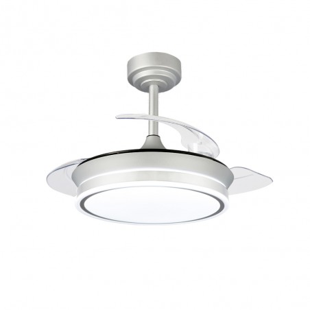 Ventilador de techo LED Mini Moss para estancias pequeñas. Ventilador de techo con aspas retráctiles diseñado para aportar flujo de aire e iluminación en dormitorios y salones pequeños. Cuenta con un motor ultrasilencioso de 6 velocidades de giro, función inversa invierno-verano, temporizador y función brisa. En cuanto a la iluminación, puedes establecer tres tonos de iluminación (cálida, neutra o fría) y dimar la intensidad de lúmenes. El cuerpo del ventilador es de color gris y las aspas plegables son transparentes.
