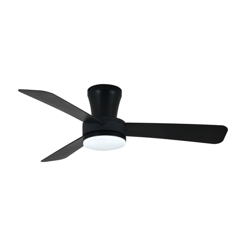 Ventilador de techo con luz LED para habitaciones medianas. Ventilador de techo con tres aspas diseñado para dormitorios y estancias de 13-20 metros cuadrados. Iluminación LED regulable en intensidad y en temperatura de color. El motor es DC por lo que emite muy poco ruido y tiene seis velocidades de giro. Ventilador silencioso de color negro con tres aspas de ABS. Mando a distancia incluido.