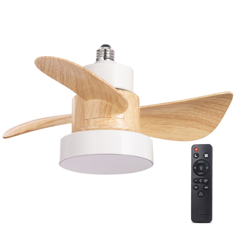 Ventilador con rosca E27 Bayad. Ventilador compacto de tres velocidades diseñado para colocar en un portalámparas o una base E27. Muy práctico para aportar un agradable flujo de aire en cualquier lugar. Además, lleva integrada iluminación LED de 15W regulable en intensidad y temperatura de color. Ventilador de color blanco con aspas de ABS efecto madera de haya.