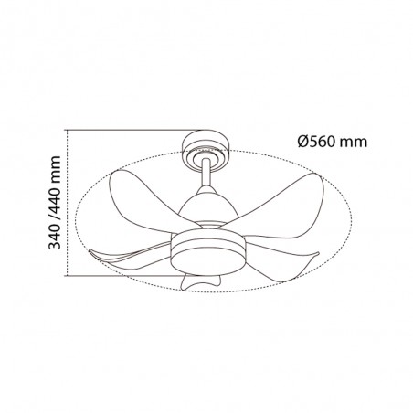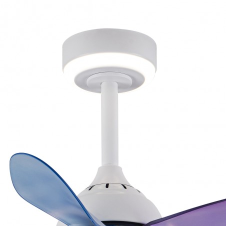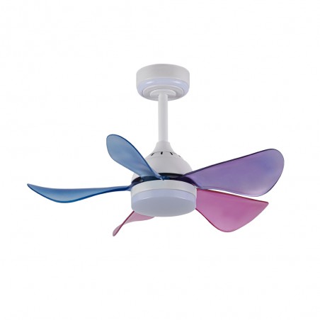 Ventilador de techo para habitaciones infantiles. Ventilador pequeño de cinco aspas de colores ideal para colocar en techos de habitaciones de niños y niñas. Aporta un agradable flujo de aire y emite muy poco de ruido en funcionamiento gracias a su motor DC. Además, cuenta con iluminación LED regulable en temperatura de color e intensidad de lúmenes. El ventilador es de color blanco con cinco aspas de policarbonato en colores azul, morado y magenta. Temporizador, función de giro inversa y memoria de encendido. Mando a distancia incluido.
