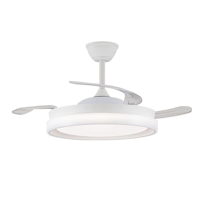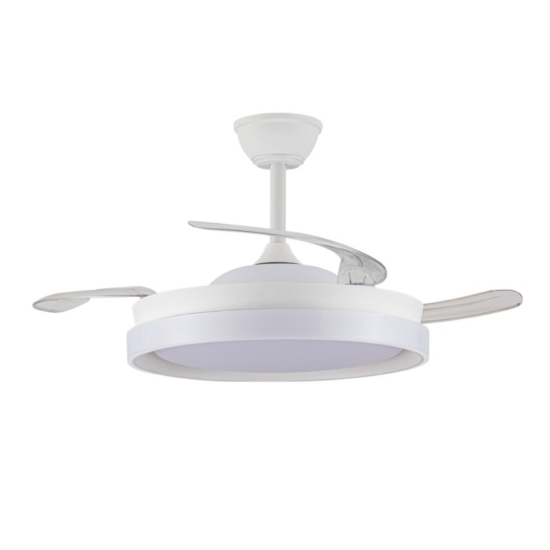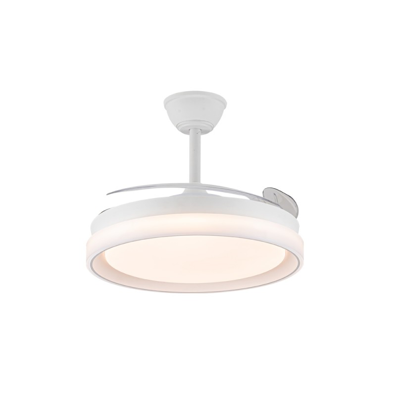 Ventilador silencioso para dormitorios. Ventilador de color blanco con aspas retráctiles diseñado especialmente para dormitorios y salones. Su motor DC de seis velocidades emite el mínimo de ruido cuando el ventilador está en funcionamiento. Cuenta con iluminación LED de bajo consumo y puede regularse con el mando a distancia de manera sencilla. Función inversa inverno verano, temporizador y memoria de color. Ventilador silencioso con aspas retráctiles.