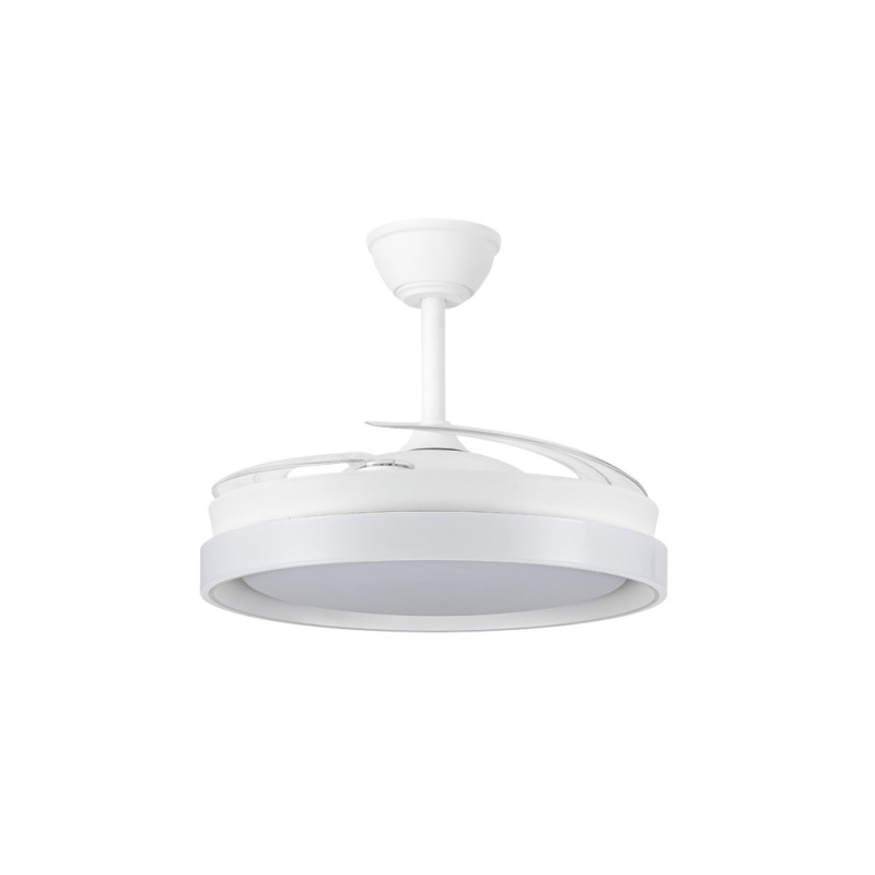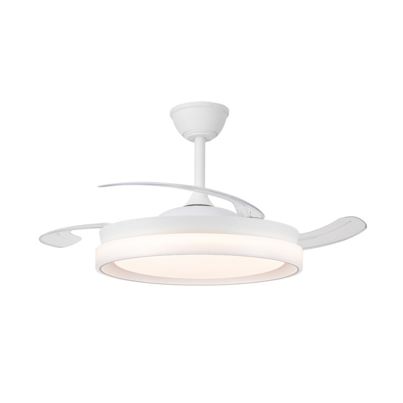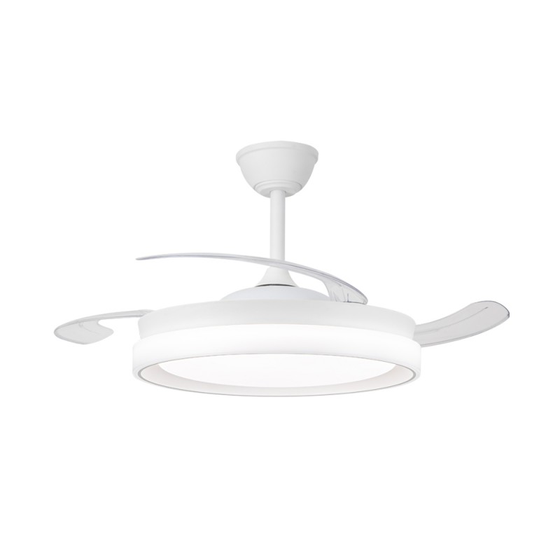 Ventilador silencioso para dormitorios. Ventilador de color blanco con aspas retráctiles diseñado especialmente para dormitorios y salones. Su motor DC de seis velocidades emite el mínimo de ruido cuando el ventilador está en funcionamiento. Cuenta con iluminación LED de bajo consumo y puede regularse con el mando a distancia de manera sencilla. Función inversa inverno verano, temporizador y memoria de color. Ventilador silencioso con aspas retráctiles.