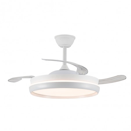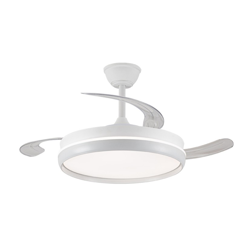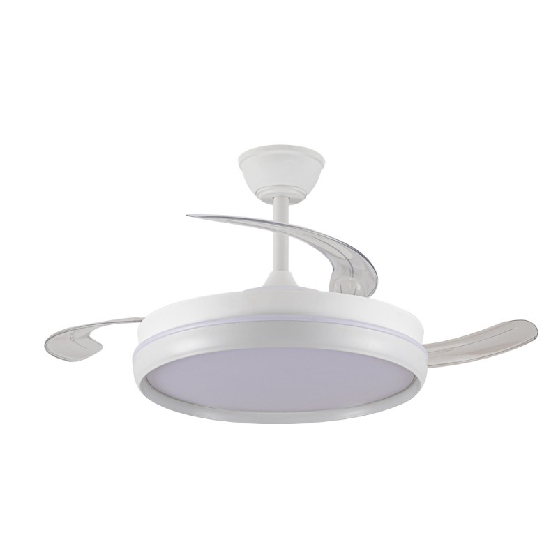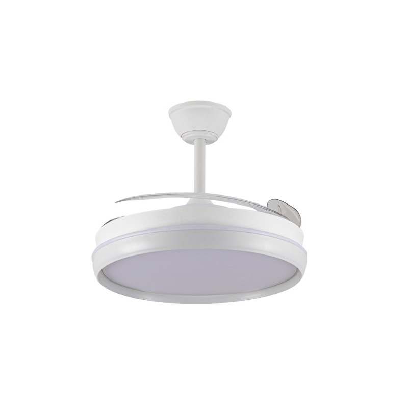 Ventilador silencioso para dormitorios. Ventilador de color blanco con aspas retráctiles diseñado especialmente para dormitorios y salones. Su motor DC de seis velocidades emite el mínimo de ruido cuando el ventilador está en funcionamiento. Cuenta con iluminación LED de bajo consumo y puede regularse con el mando a distancia de manera sencilla. Función inversa inverno verano, temporizador y memoria de color. Ventilador silencioso con aspas retráctiles.