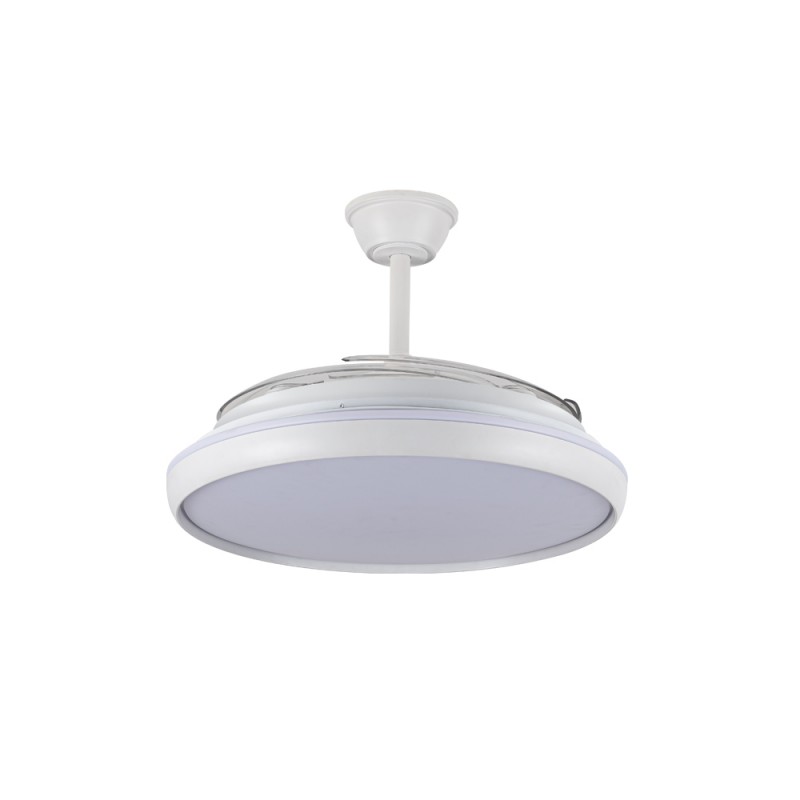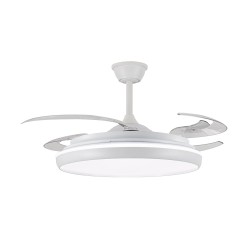 Ventilador silencioso para dormitorios. Ventilador de color blanco con aspas retráctiles diseñado especialmente para dormitorios y salones. Su motor DC de seis velocidades emite el mínimo de ruido cuando el ventilador está en funcionamiento. Cuenta con iluminación LED de bajo consumo y puede regularse con el mando a distancia de manera sencilla. Función inversa inverno verano, temporizador y memoria de color. Ventilador silencioso con aspas retráctiles.