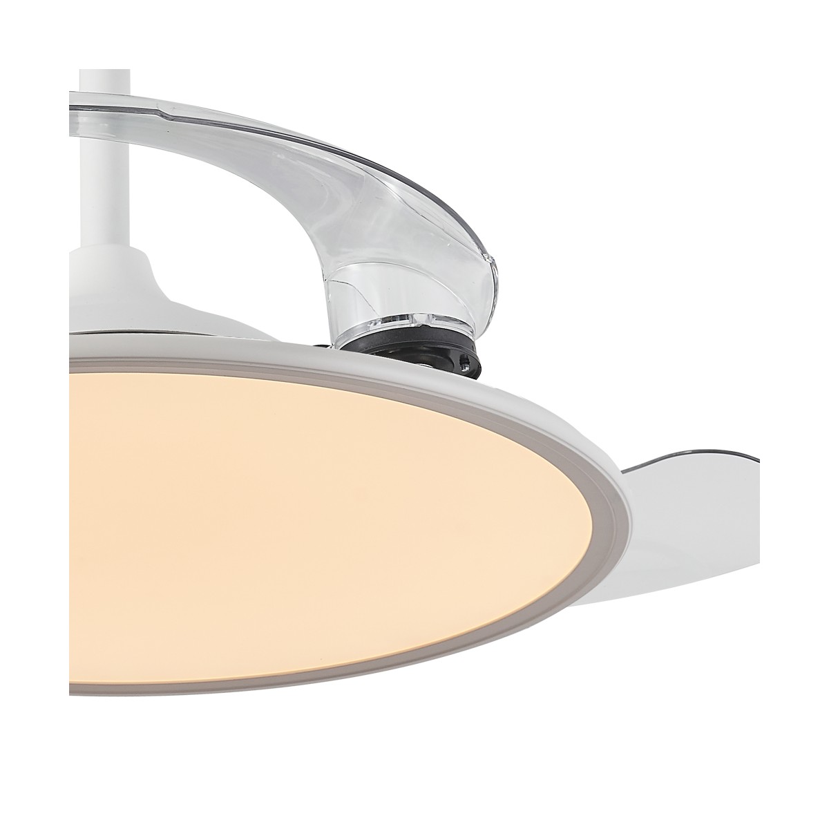 Ventilador de techo LED con aspas retráctiles Trident. Ventilador moderno de color blanco con diseño minimalista y práctico, ideado tanto aportar ventilación como iluminar la estancia. Lleva integrada iluminación LED dimmable en intensidad de lúmenes y tres temperaturas de color (3000-4000-6000K). Además, con el mando a distancia puedes seleccionar función brisa, un modo luz de noche o fijar el apagado del ventilador a las 2-4 horas. Su diseño con diámetro de 107 cm. con las aspas desplegadas lo hace ideal para estancias de 13-20 metros cuadrados. Difusor de 48.50 centímetros de diámetro. Motor DC ultrasilencioso con seis velocidades de giro y función inversa invierno verano.