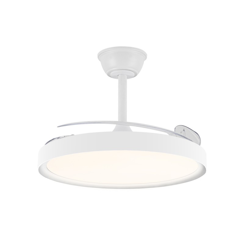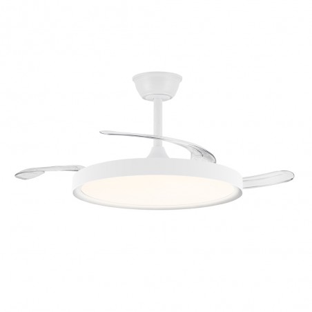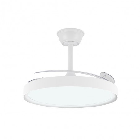 Ventilador lámpara con motor silencioso Polaris. Ventilador de color blanco con aspas retráctiles, ideal para dormitorios y salones (13-20 m2). Diseño minimalista en acabado blanco, con motor de acero, aspas de policarbonato y difusor de PMMA. Su motor DC de seis velocidades emite el mínimo de ruido cuando el ventilador está en funcionamiento. Cuenta con iluminación LED de bajo consumo la cual puedes regular tanto en intensidad como en tono de color. Cuenta con función inversa inverno-verano, temporizador y memoria de color. Mando a distancia incluido.