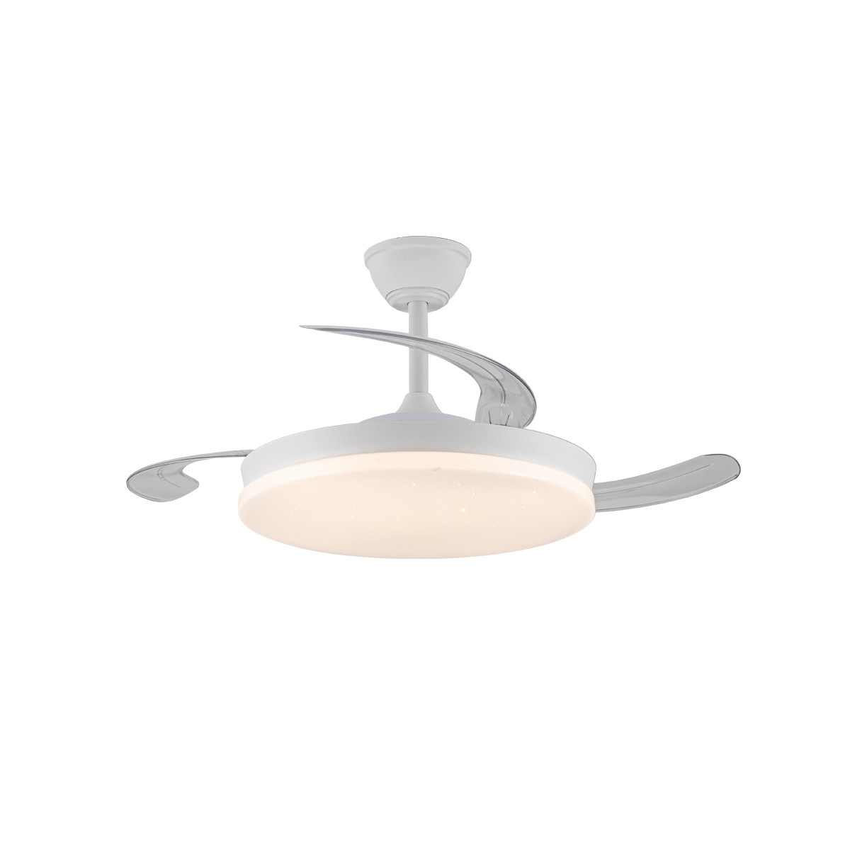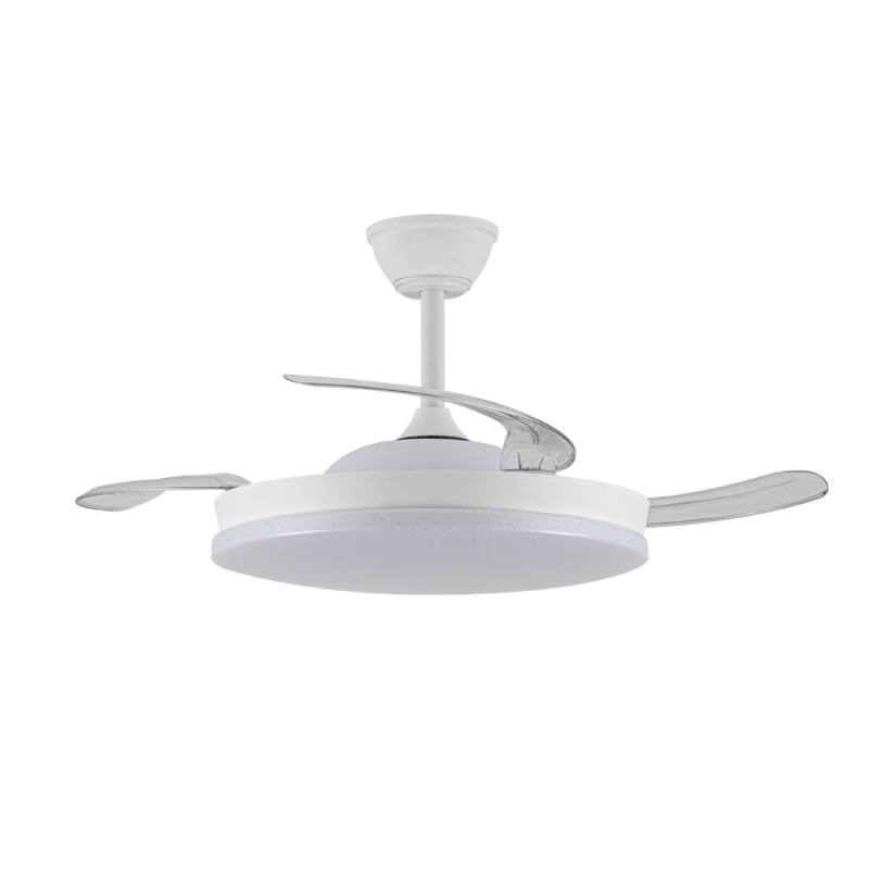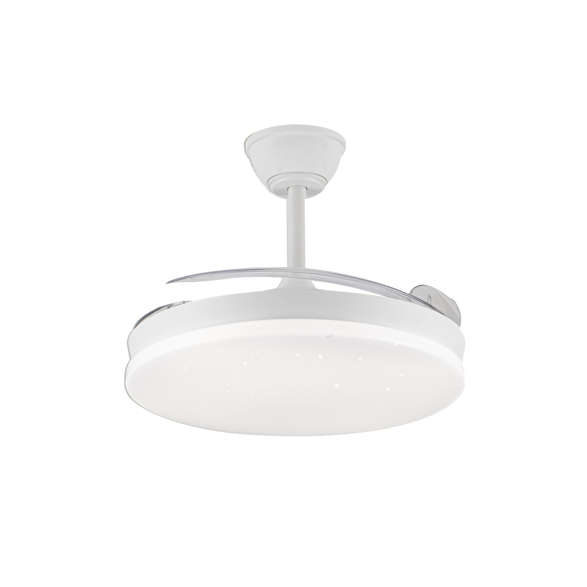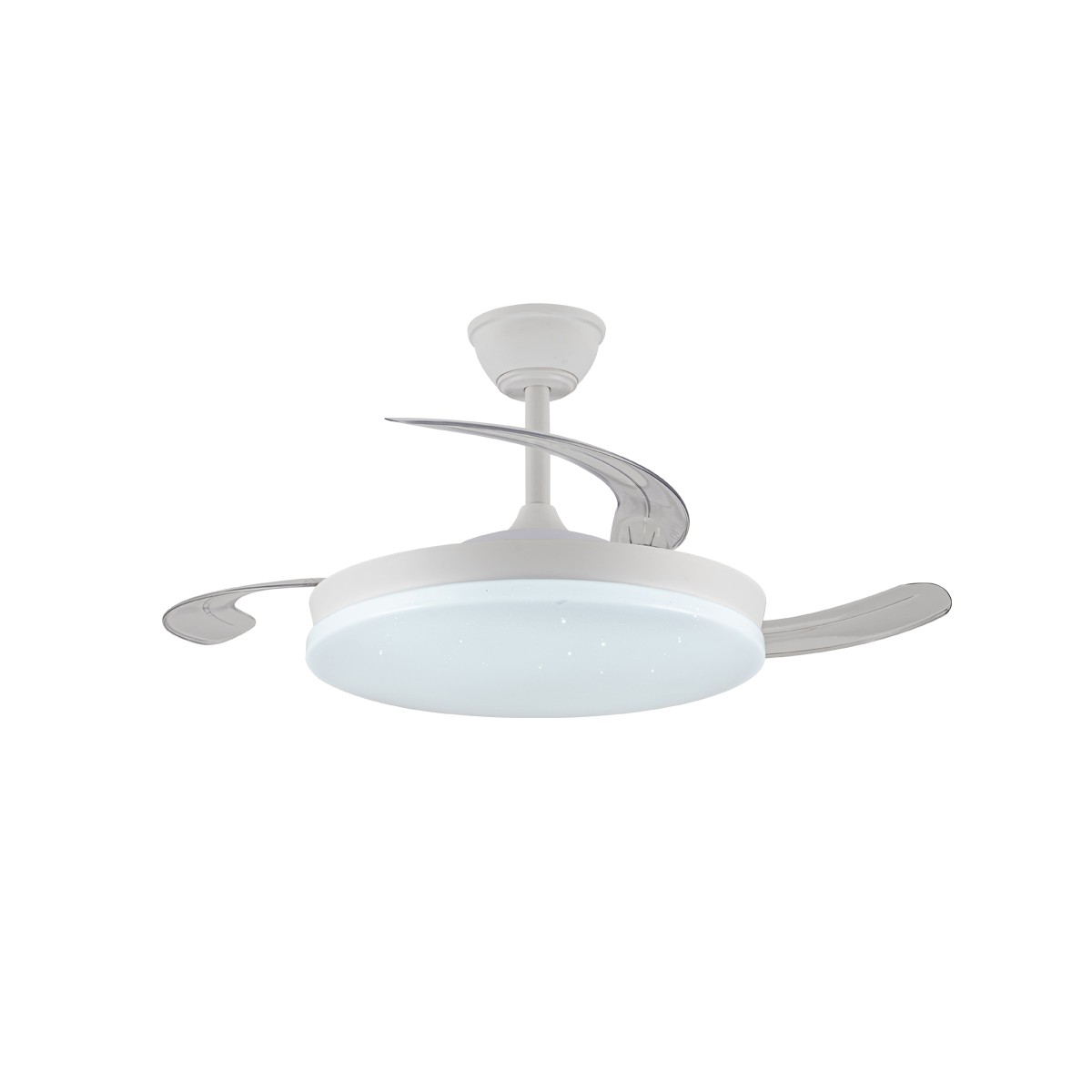 Ventilador silencioso Stars Evo para dormitorios. Ventilador de color blanco con aspas retráctiles, diseñado con un difusor de PMMA con un decorativo efecto de estrellas. Su motor DC de seis velocidades emite el mínimo de ruido cuando el ventilador está en funcionamiento. Cuenta con iluminación LED regulable en intensidad y tono de color, función inversa inverno-verano, temporizador y memoria de color. Puedes controlar el ventilador con el mando a distancia o con tu smartphone vía app.