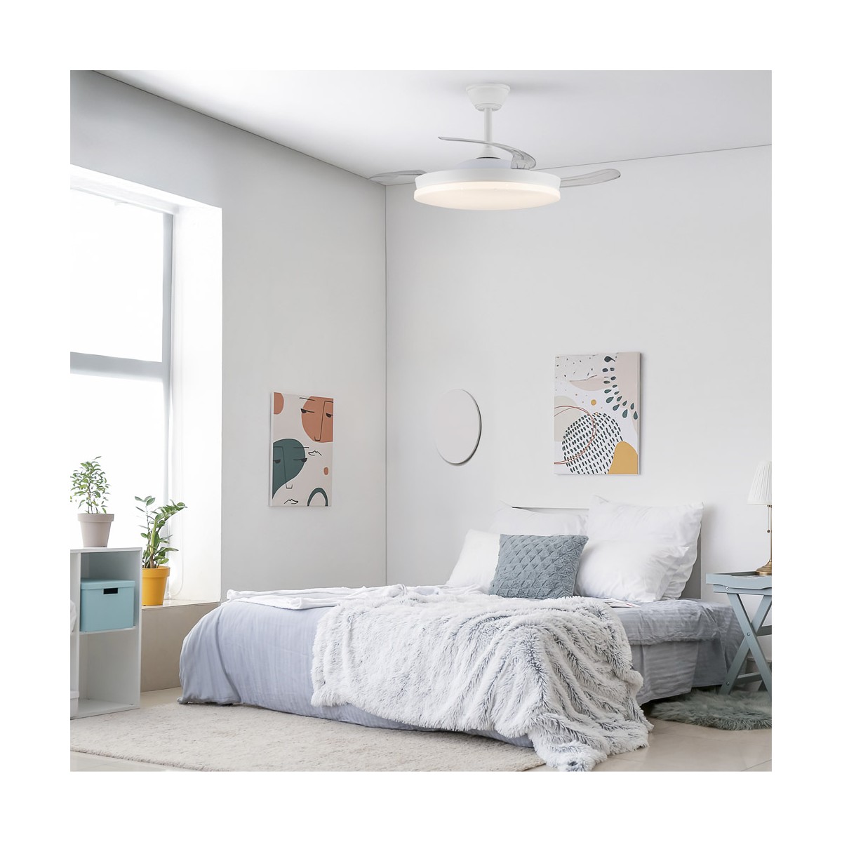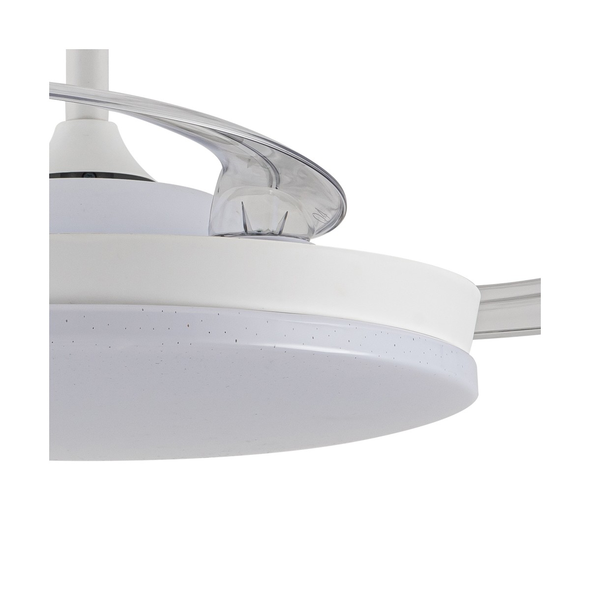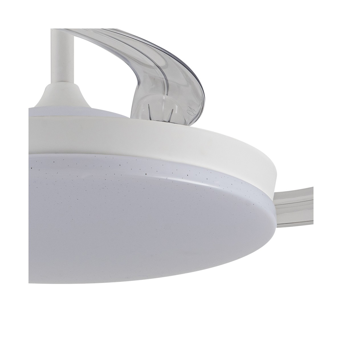 Ventilador silencioso Stars Evo para dormitorios. Ventilador de color blanco con aspas retráctiles, diseñado con un difusor de PMMA con un decorativo efecto de estrellas. Su motor DC de seis velocidades emite el mínimo de ruido cuando el ventilador está en funcionamiento. Cuenta con iluminación LED regulable en intensidad y tono de color, función inversa inverno-verano, temporizador y memoria de color. Puedes controlar el ventilador con el mando a distancia o con tu smartphone vía app.