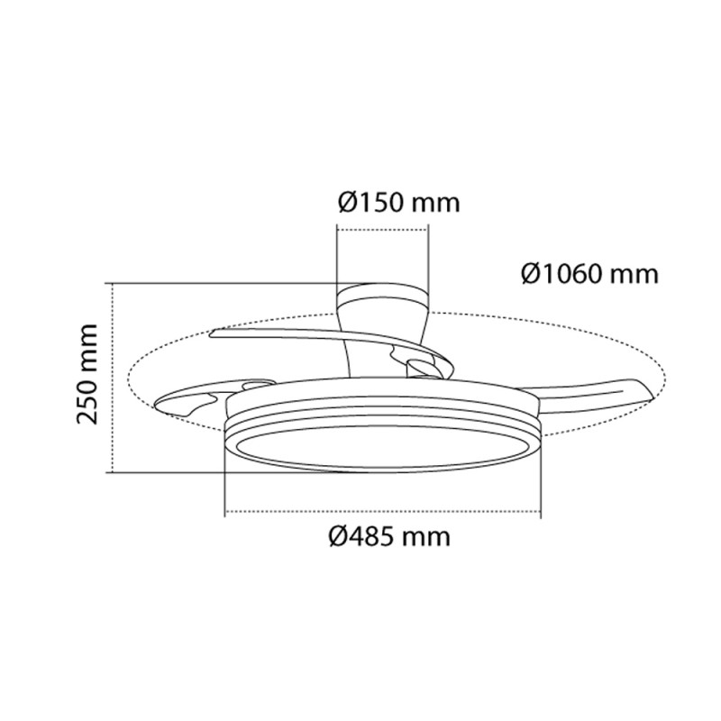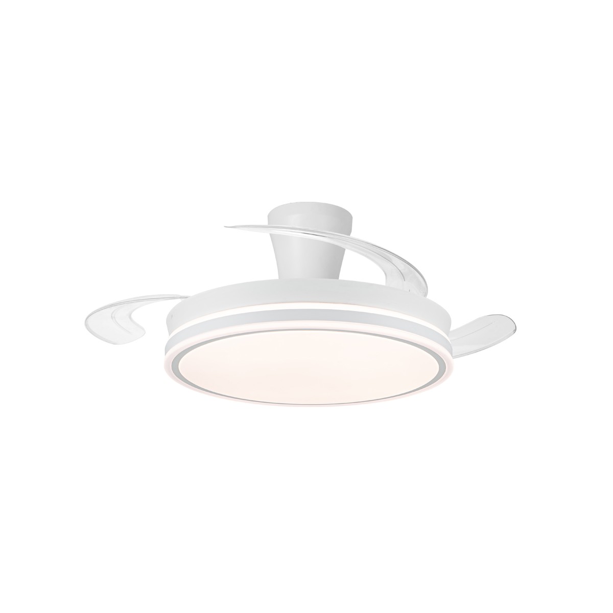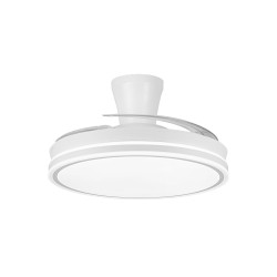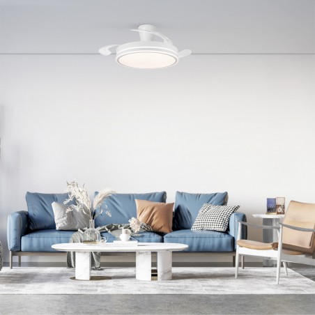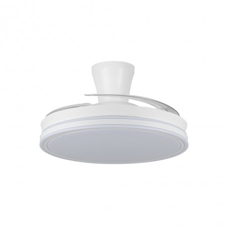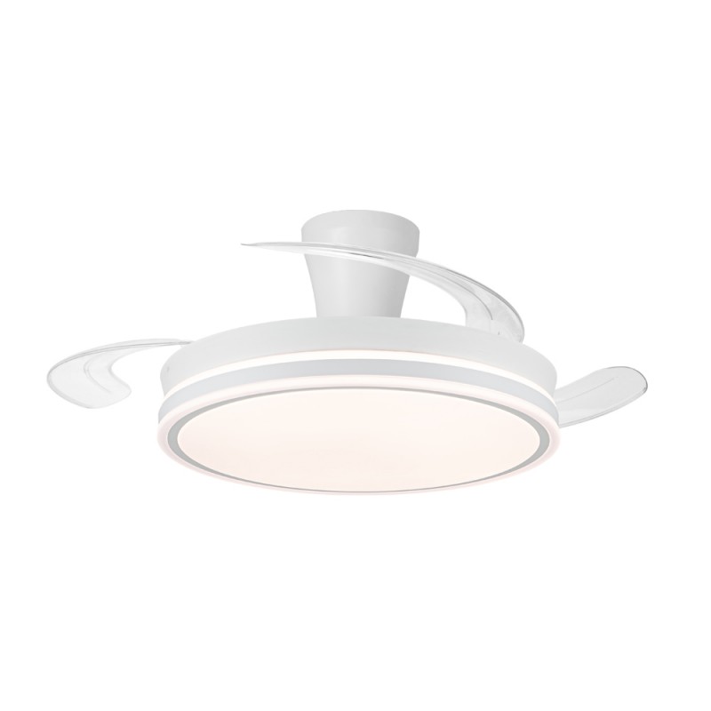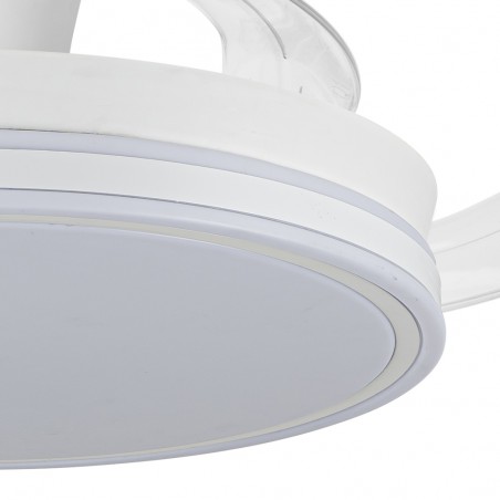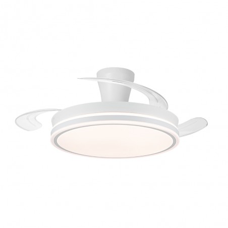 Ventilador lampara silencioso Supereco Long. Ventilador de color blanco con aspas retráctiles diseñado para dormitorios y salones medianos (13-20 m2). Su motor DC de seis velocidades emite el mínimo de ruido cuando el ventilador está en funcionamiento. Cuenta con iluminación LED regulable en intensidad y en tono de color. Función inversa inverno verano, temporizador y memoria de color. Ventilador silencioso con aspas retráctiles e iluminación LED integrada.
