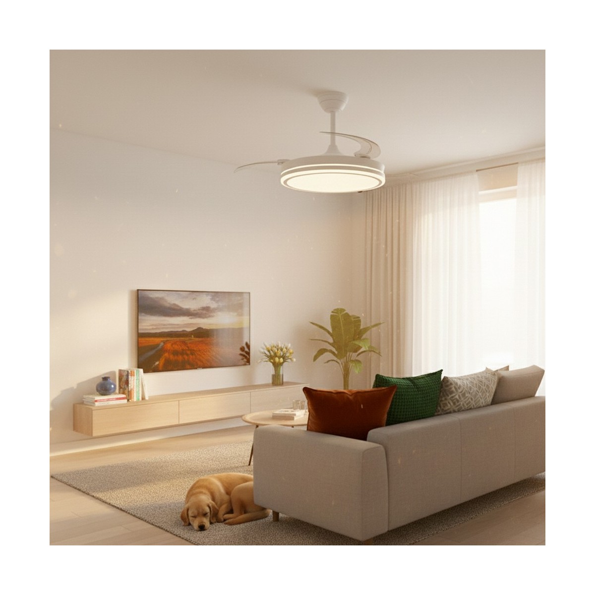 Ventilador silencioso para dormitorios. Ventilador de color blanco con aspas retráctiles diseñado especialmente para dormitorios y salones. Su motor DC de seis velocidades emite el mínimo de ruido cuando el ventilador está en funcionamiento. Cuenta con iluminación LED de bajo consumo y puede regularse con el mando a distancia de manera sencilla. Función inversa inverno verano, temporizador y memoria de color. Ventilador silencioso con aspas retráctiles. FUNCIÓN NOCHE ULTRA SILENCIOSO