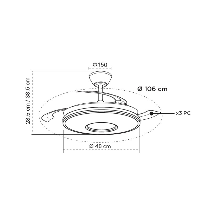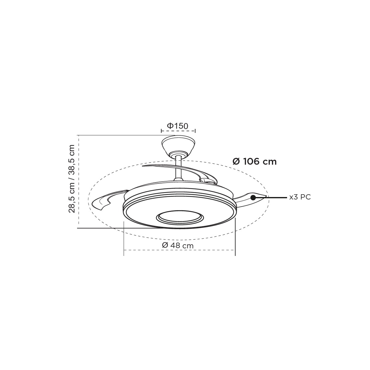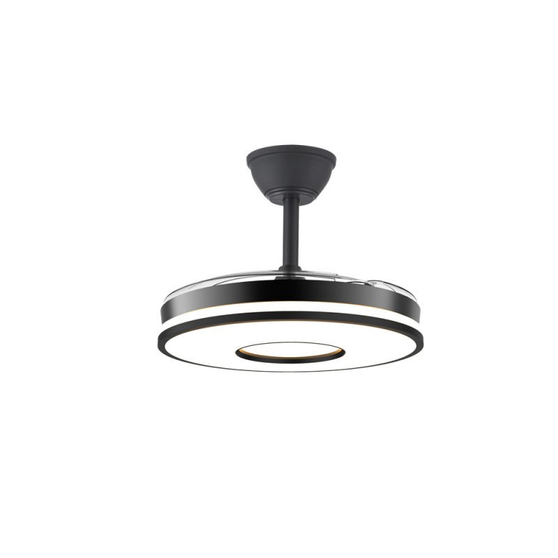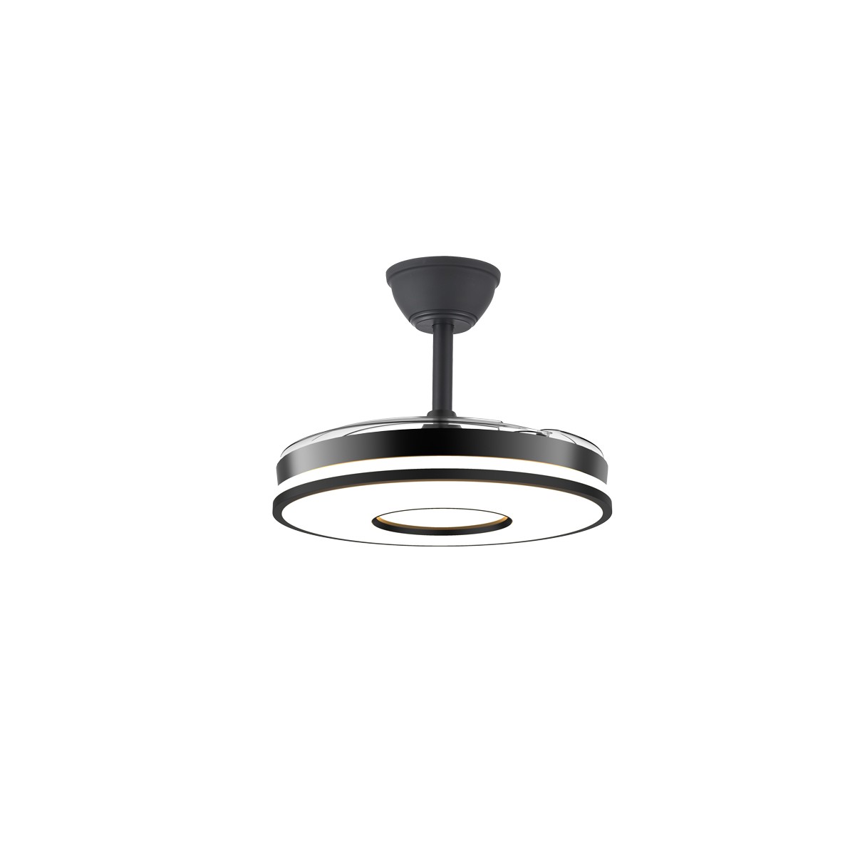 Ventilador silencioso para dormitorios Bond Negro. Ventilador de color blanco con aspas retráctiles diseñado especialmente para dormitorios y salones. Su motor DC de seis velocidades emite el mínimo de ruido cuando el ventilador está en funcionamiento. Cuenta con iluminación LED de bajo consumo y puede regularse con el mando a distancia de manera sencilla. Función inversa inverno verano, temporizador y memoria de color. Ventilador silencioso con aspas retráctiles.