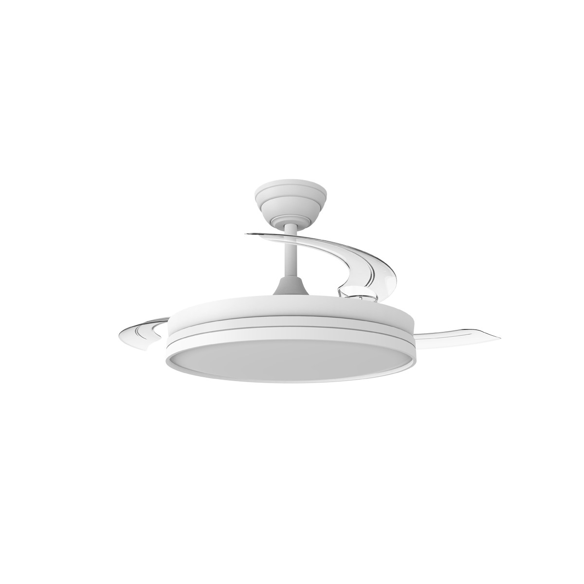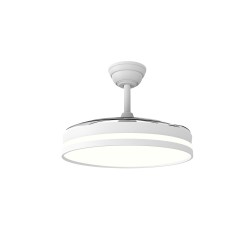 Ventilador silencioso para dormitorios Ferro Eco. Ventilador de color blanco con aspas retráctiles diseñado especialmente para dormitorios y salones. Su motor DC de seis velocidades emite el mínimo de ruido cuando el ventilador está en funcionamiento. Cuenta con iluminación LED de bajo consumo y puede regularse con el mando a distancia de manera sencilla. Función inversa inverno verano, temporizador y memoria de color. Ventilador silencioso con aspas retráctiles.