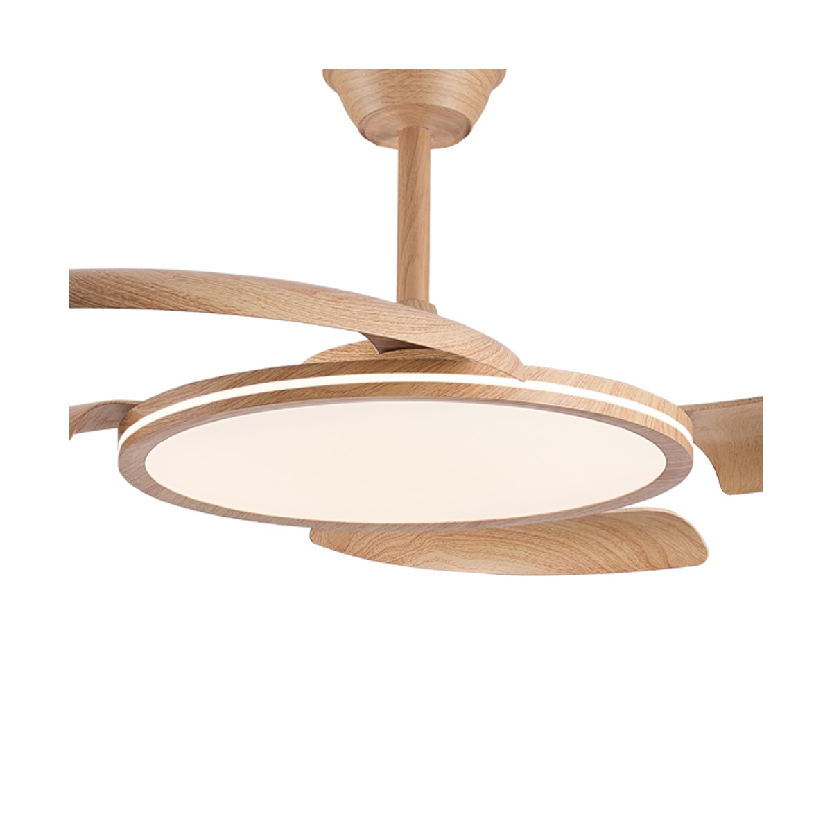 Ventilador silencioso Key Madera con aspas retráctiles. Ventilador de color madera con aspas retráctiles diseñado especialmente para dormitorios y salones. Su motor DC de seis velocidades emite el mínimo de ruido cuando el ventilador está en funcionamiento. Cuenta con iluminación LED de bajo consumo y puede regularse con el mando a distancia de manera sencilla. Función inversa inverno verano, temporizador y memoria de color. Ventilador silencioso con aspas retráctiles.