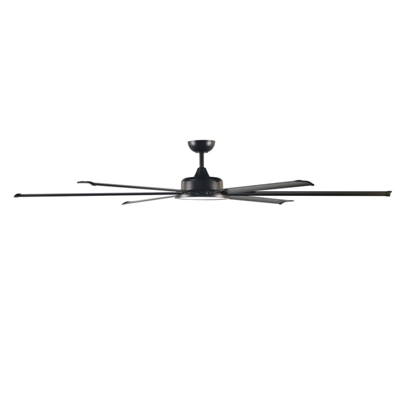 Ventilador de techo de gran tamaño Avon. Ventilador de techo con seis aspas y un diámetro de 180 centímetros. Diseñado para instalar en naves industriales y espacios amplios de interior. Motor de acero, aspas de aluminio y difusor de PMMA. Acabado color negro. Mando a distancia para controlar el ventilador y la iluminación. Motor DC.