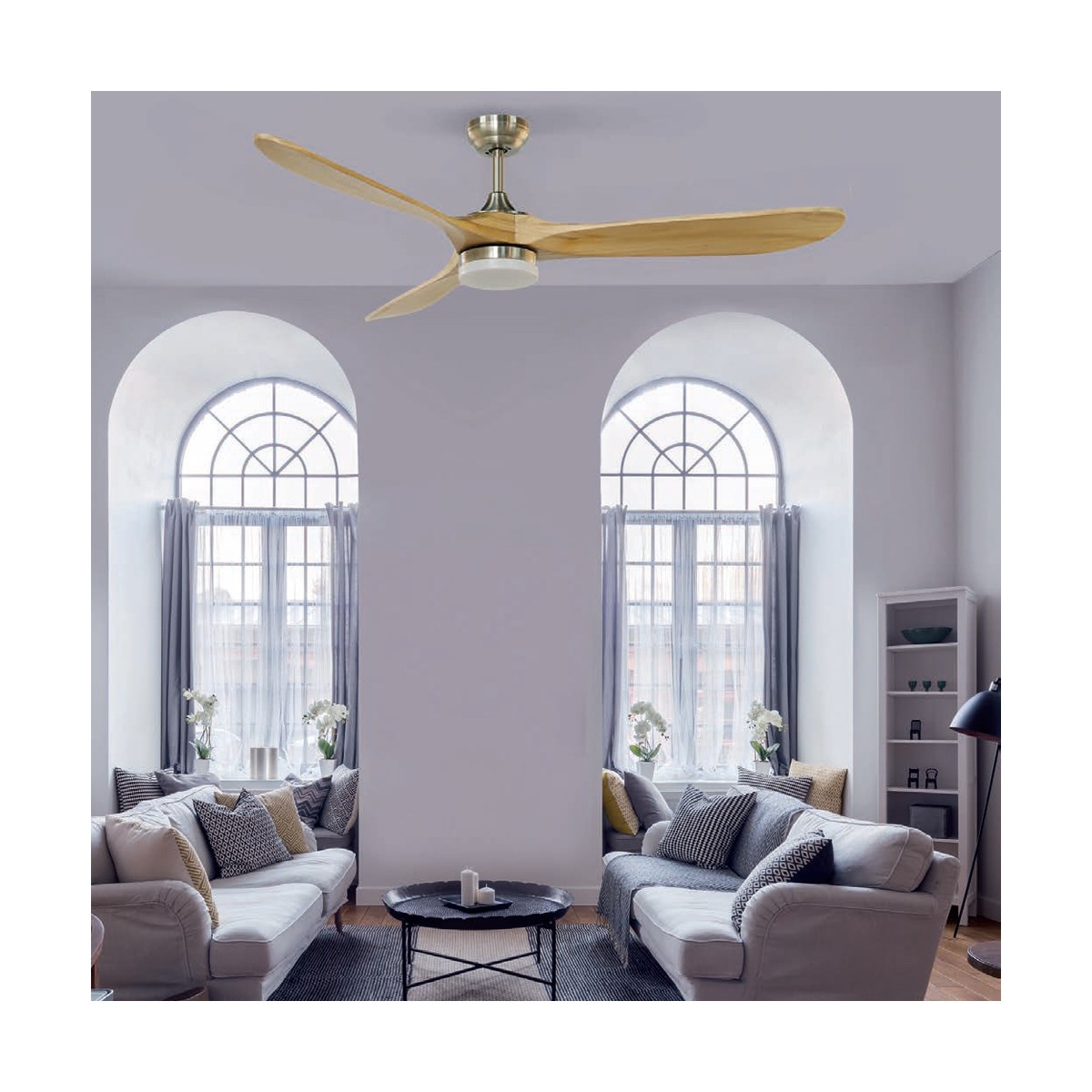 Ventilador de techo Nine Big con luz LED para estancias amplias. Diseño de estilo nórdico con estructura de metal níquel y tres aspas de madera natural. Con el mando a distancia puedes controlar la velocidad de giro y regular la iluminación. Motor DC silencioso de seis velocidades de giro y función inversa inverno-verano.