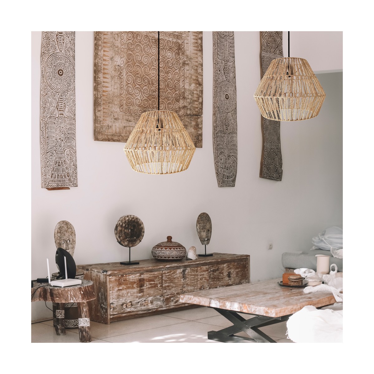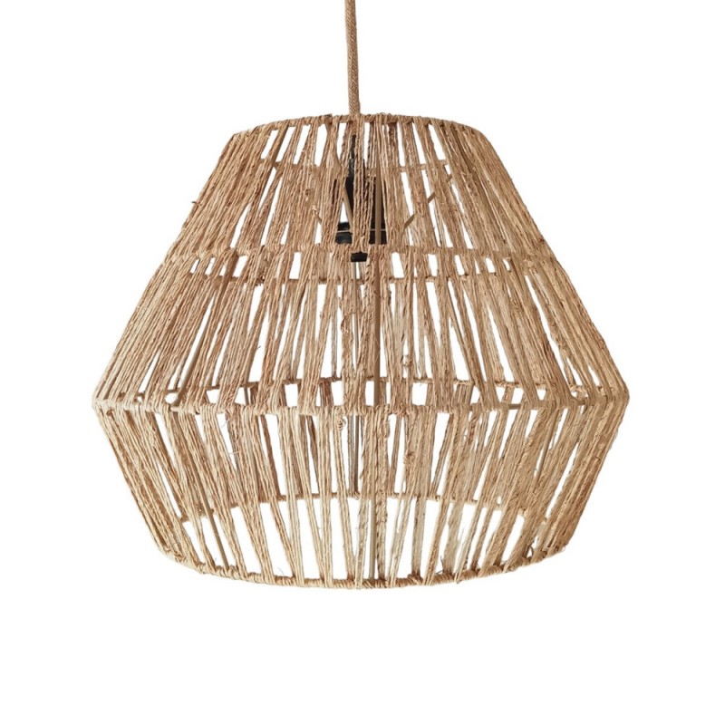 Abat-jour en jute naturel Tenai Algues. La structure de l'abat-jour est recouverte de fines ficelles de jute naturel, ce qui donne à l'abat-jour une touche et un style uniques. Fixez une suspension de plafond E27 pour créer une lampe suspendue boho chic pour votre entreprise. Hauteur de 30 centimètres et diamètre inférieur de 40 centimètres.