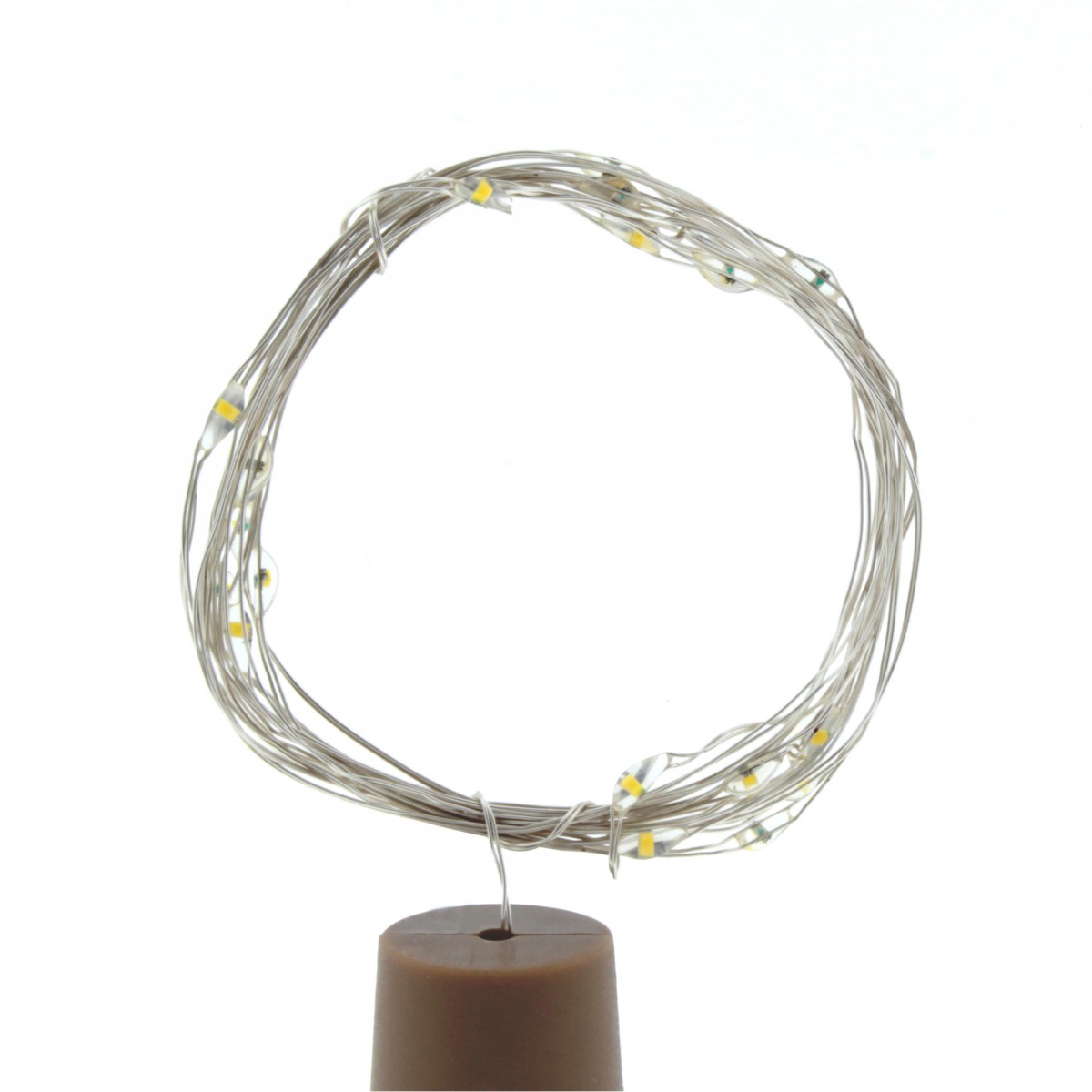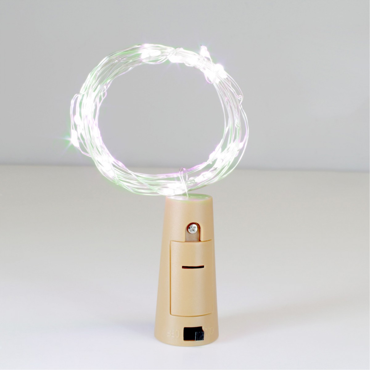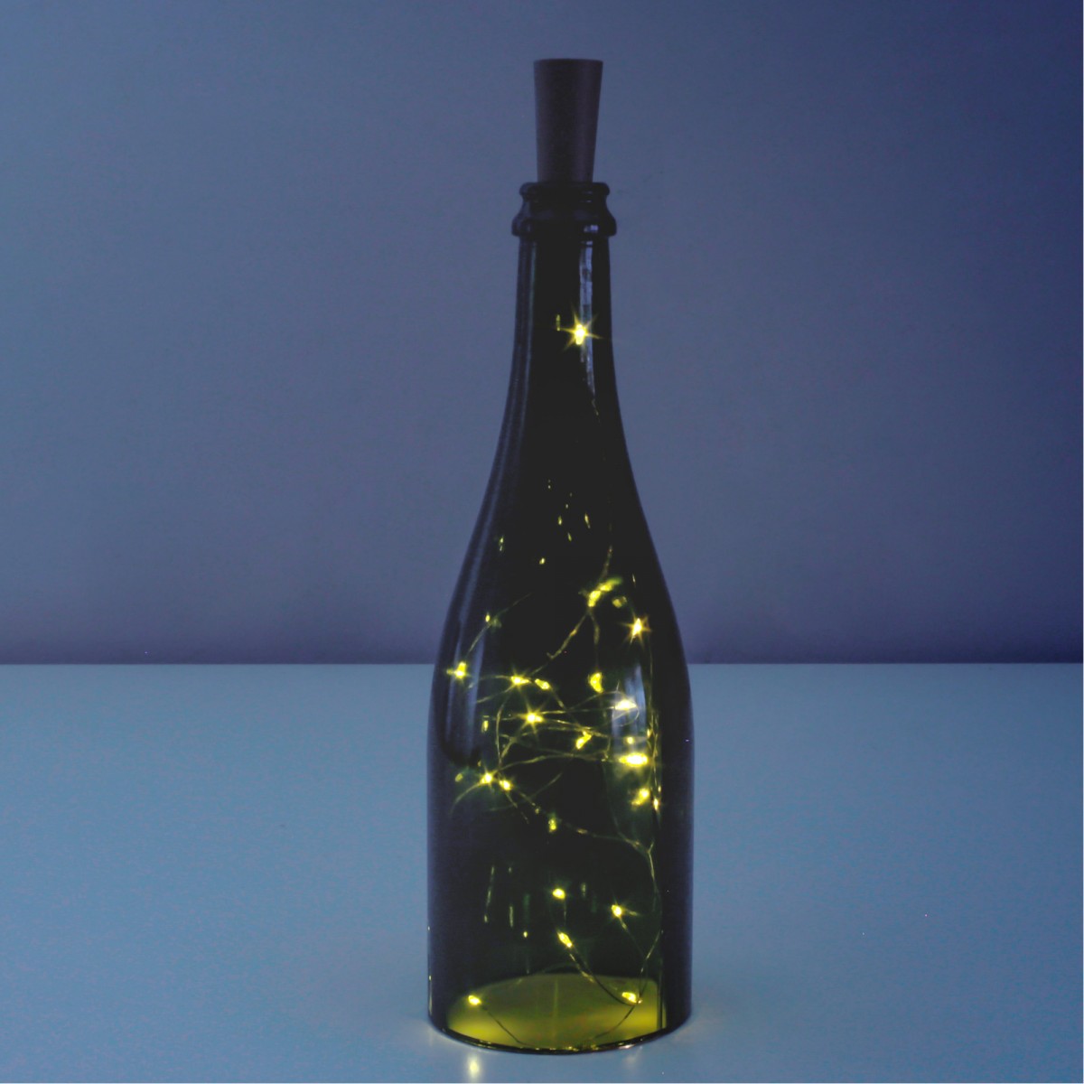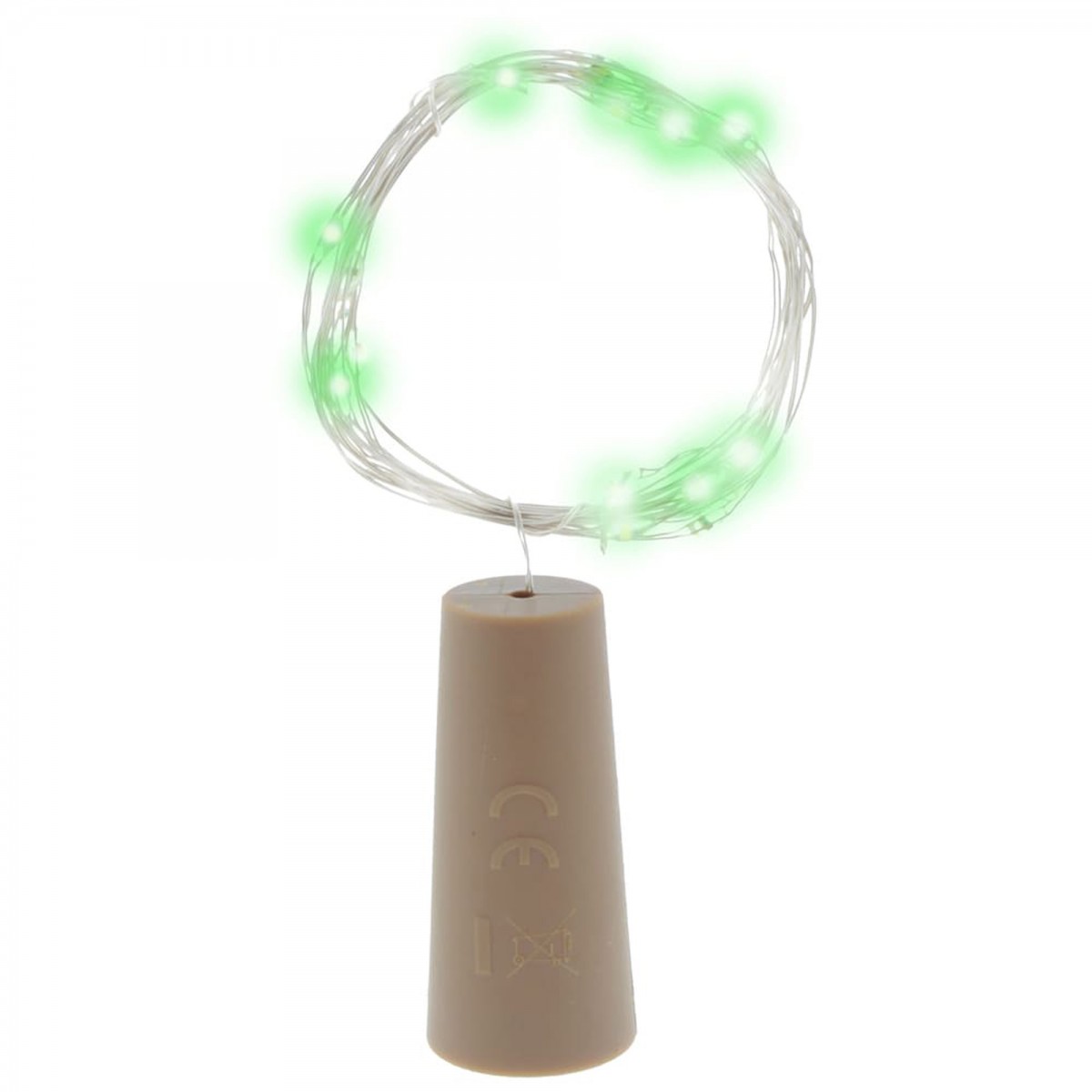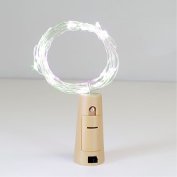 Bande LED décorative de 2 mètres avec une lumière LED verte de 1W en forme de bouchon de bouteille. Elle fonctionne avec trois piles bouton LR44. Parfait comme lumière décorative à placer à l'intérieur des bouteilles.
