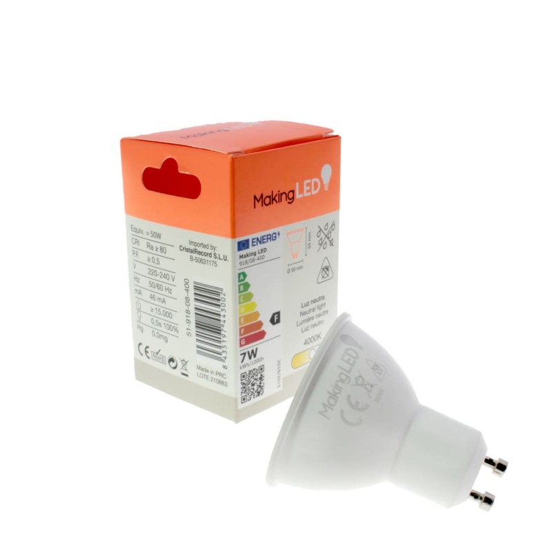 Ampoule Led de type dichroïque avec culot GU10. LED SMD et une puissance de 7W avec lumière naturelle en 4000K
