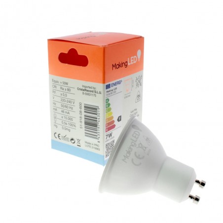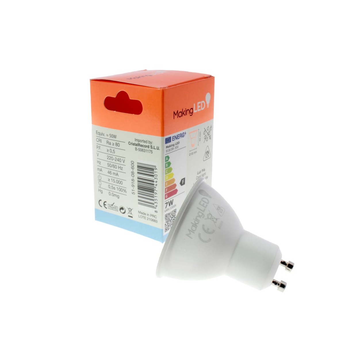 Ampoule Led de type dichroïque avec culot GU10. LED SMD et une puissance de 7W avec lumière froid en 6000K